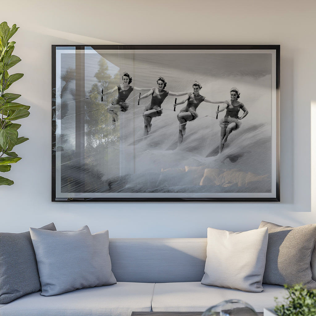Ski Stunt – Vintage Aquatic Photography Print. Four female water skiers perform an impressive synchronized routine, each resting one arm on another’s shoulder while balancing on a single ski. This striking black-and-white photograph embodies the elegance and athleticism of mid-century water sports. With their confident expressions and perfect formation, the skiers create a timeless tableau of teamwork, grace, and strength. The bright reflections on the water and fluid sense of movement bring an uplifting, summery energy to the composition. Ideal for beach houses, coastal interiors, or anyone inspired by vintage Americana and the golden age of recreation, this print celebrates both balance and beauty on the water.