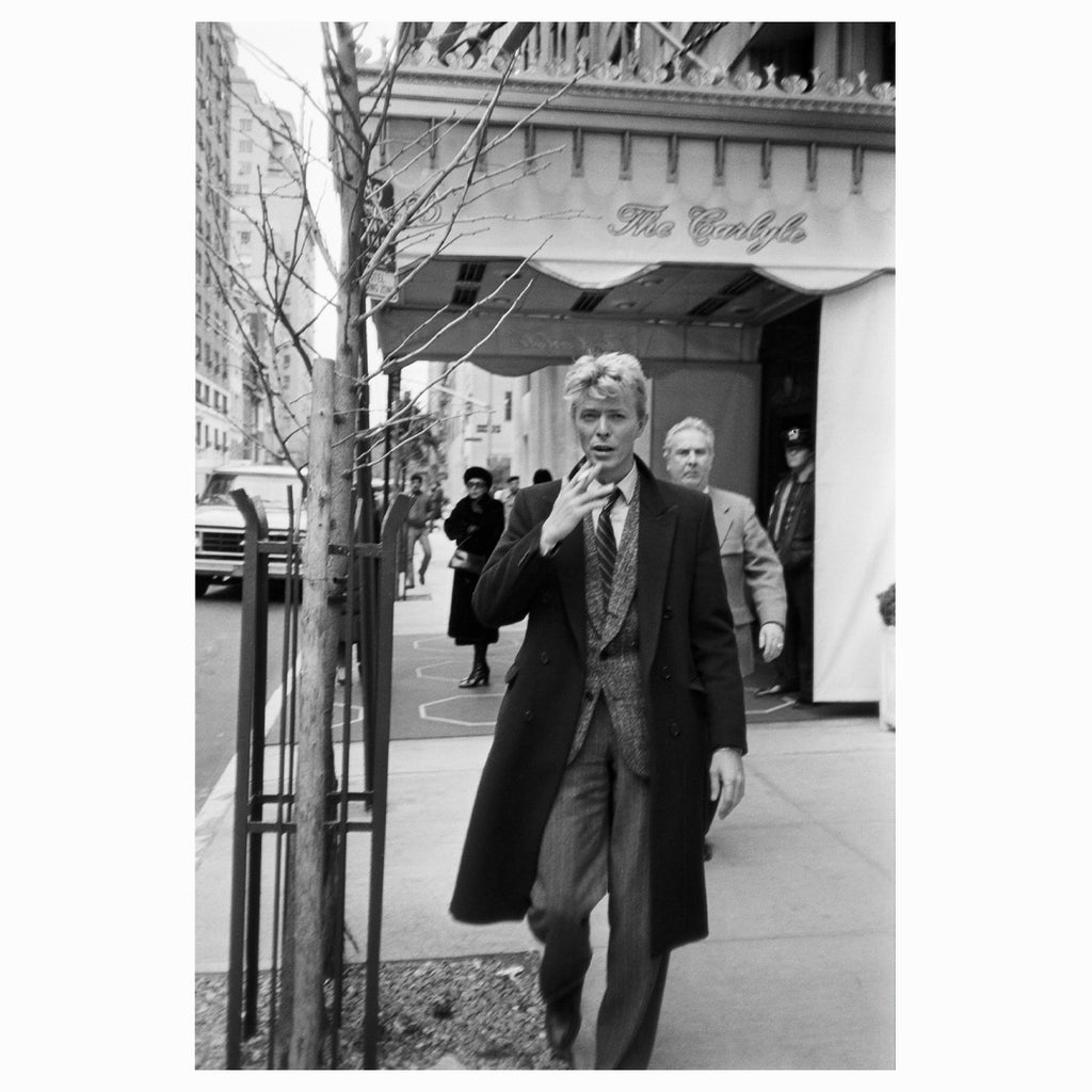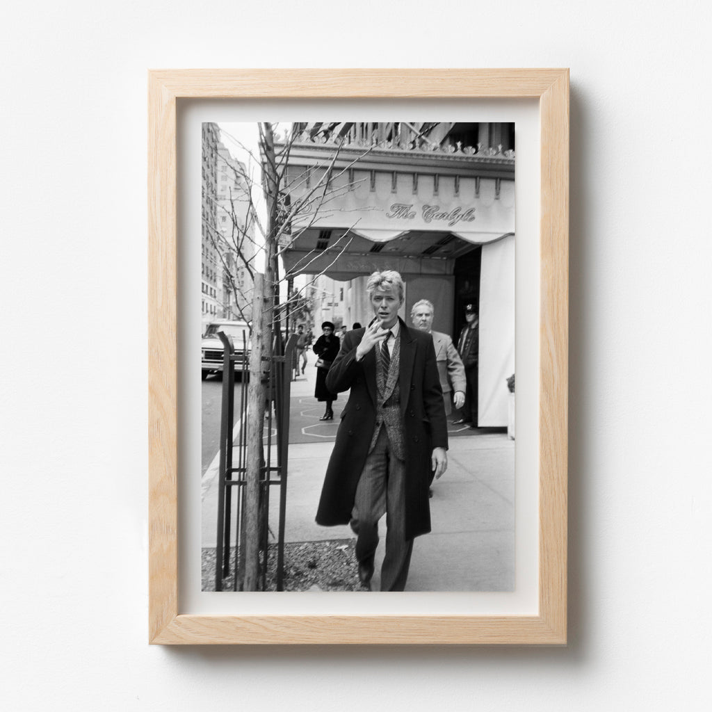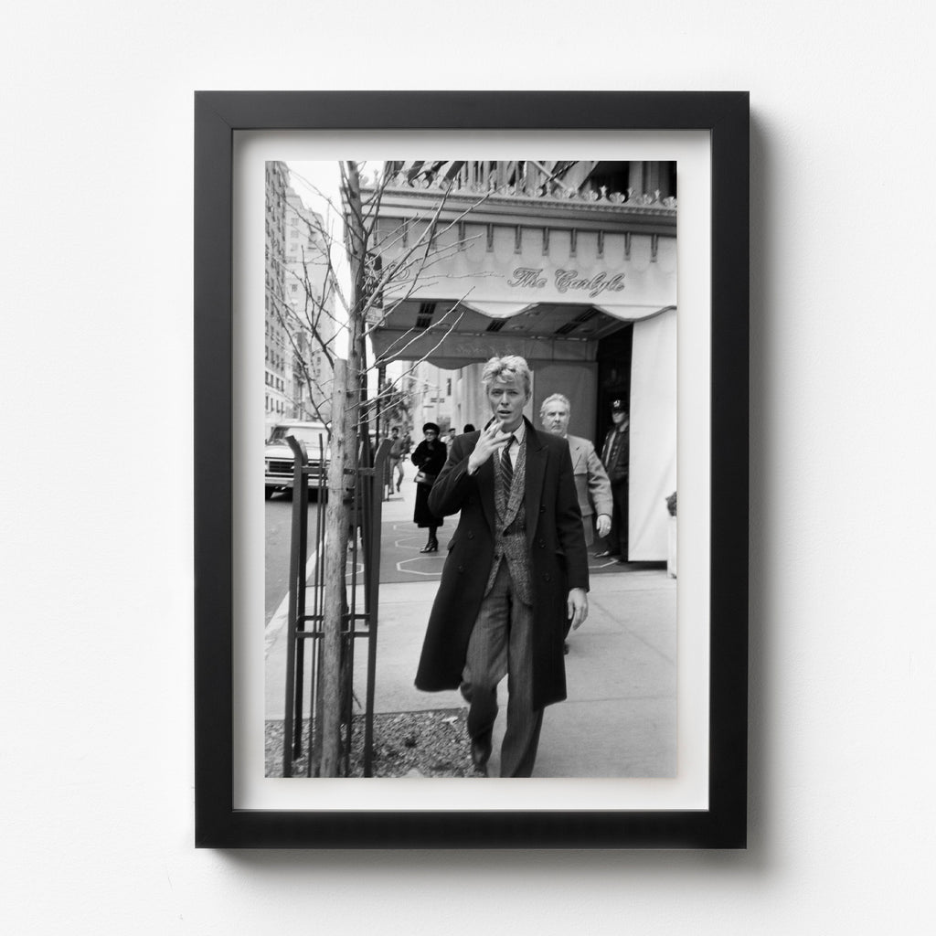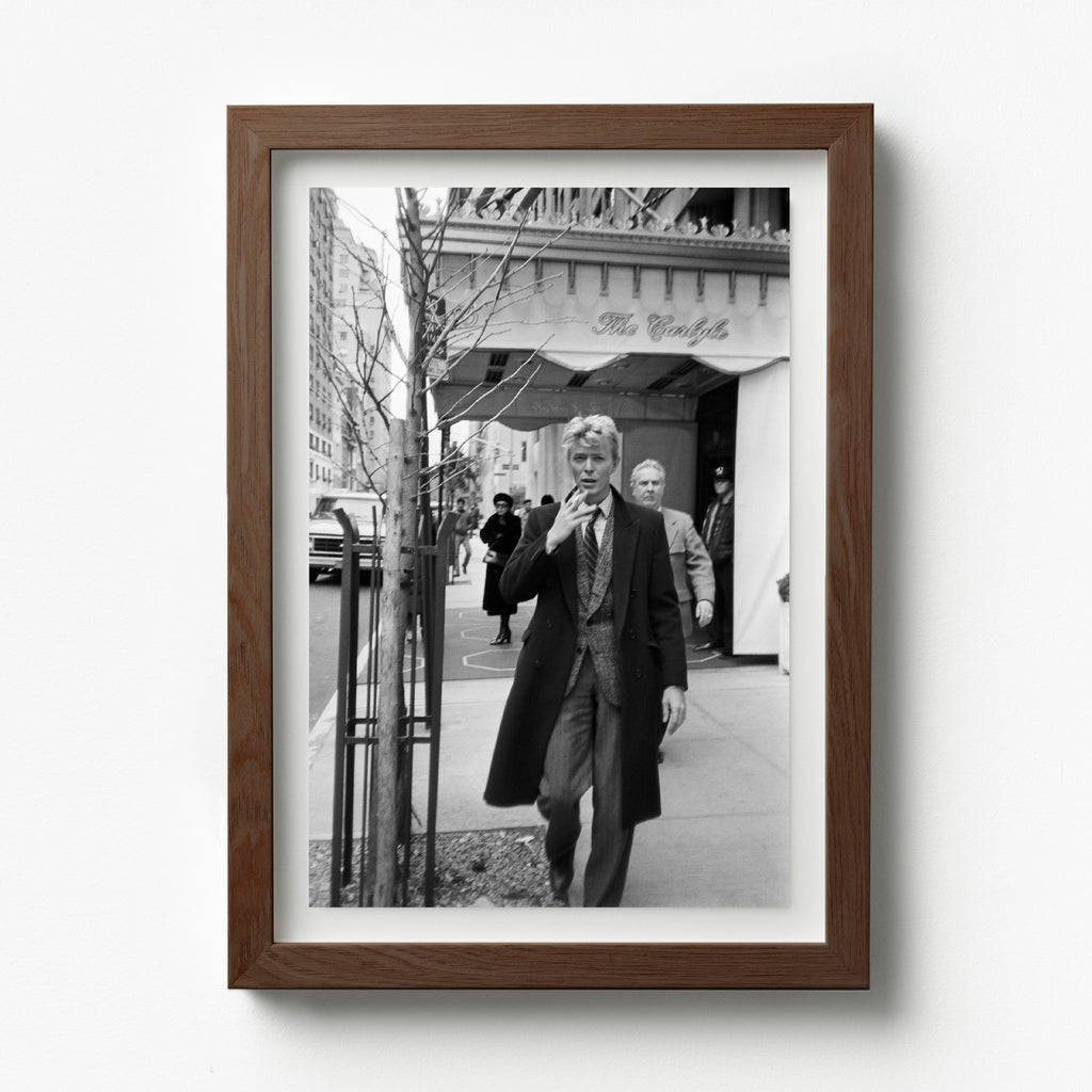 David Bowie – Outside The Carlyle, New York, 1983. English singer-songwriter David Bowie (1947–2016) on Madison Avenue, New York, 27th January 1983. He is at the Carlyle Hotel for a press conference. A candid street portrait that catches Bowie mid-stride beneath The Carlyle’s canopy, distilling the press-day energy and sharp style of early-’80s Manhattan. Ideal for interiors celebrating music history, monochrome photography, or New York icons; adds a modern edge to living rooms, hallways, or home studios.