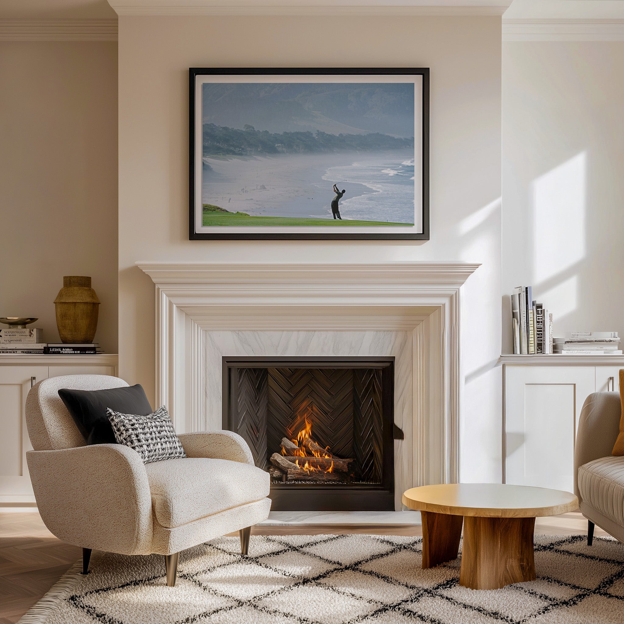 Tiger Woods At Pebble Beach – Iconic Golf Photography Print. Tiger Woods of the United States, silhouetted against the sky during play. This striking image distills power into simplicity — one of the sport’s greatest figures framed in perfect balance between motion and light. The silhouette captures an athlete at his most timeless, where posture alone tells the story of control, legacy, and poise. An ideal addition to offices, golf lounges, or modern interiors with a taste for minimalism and sport heritage. It pairs beautifully with neutral tones, structured spaces, and art that values form and quiet strength.
