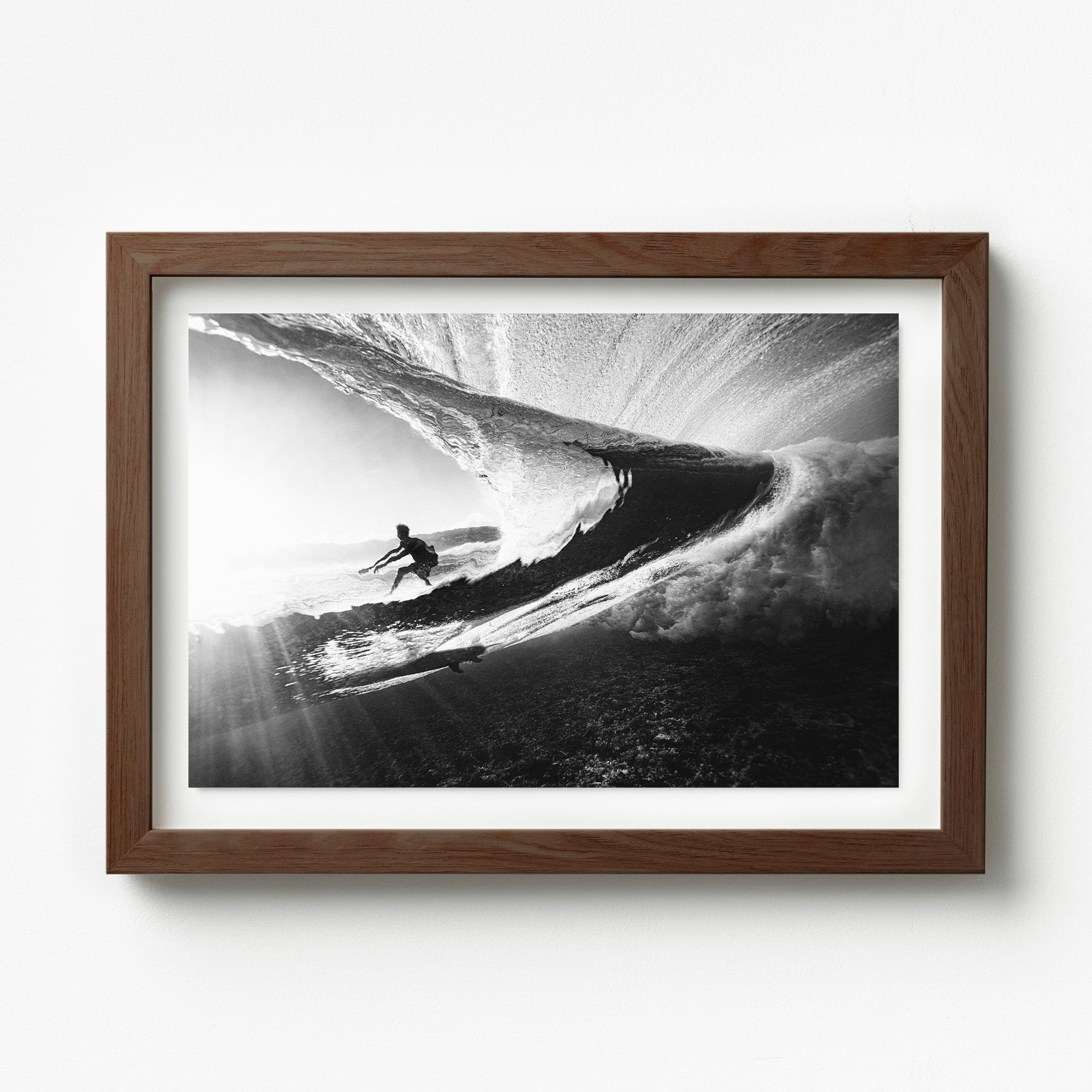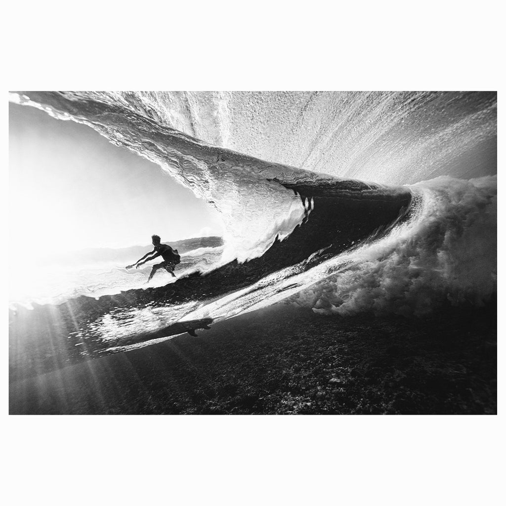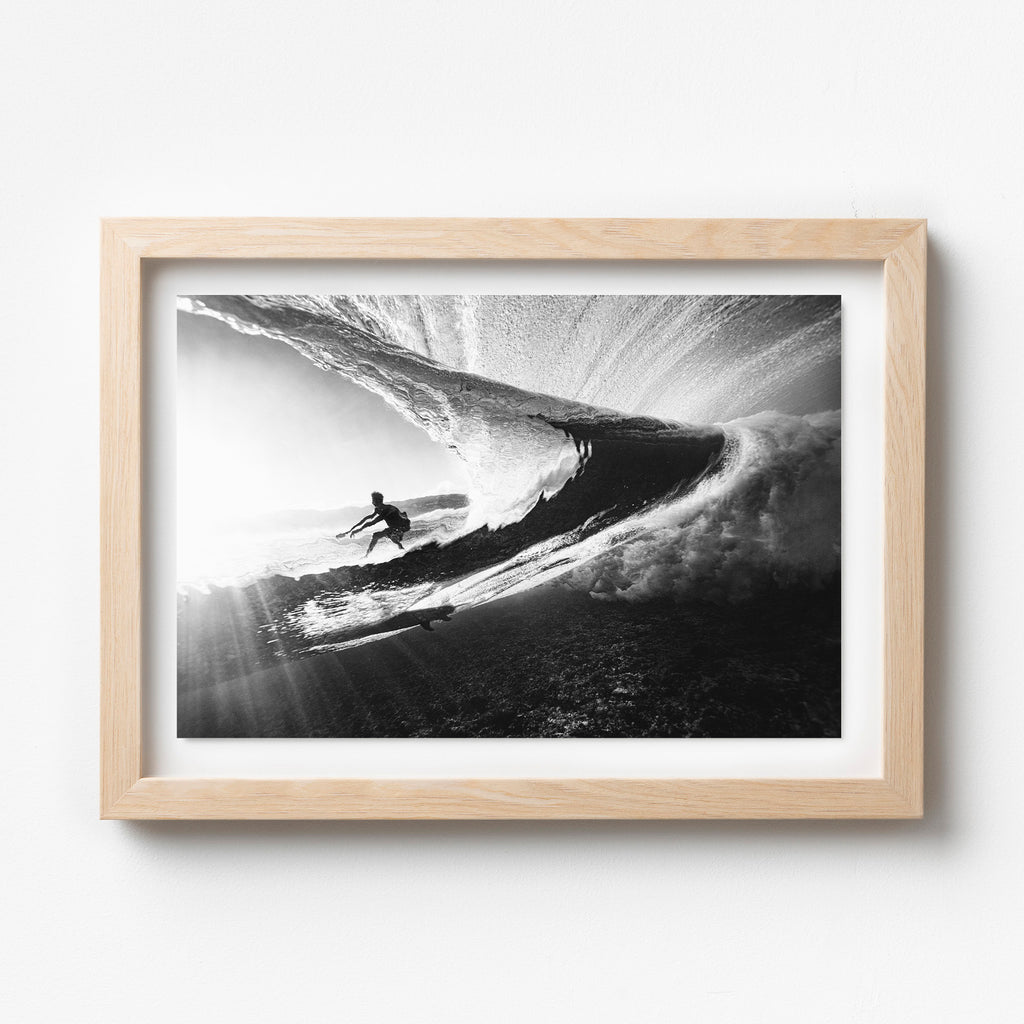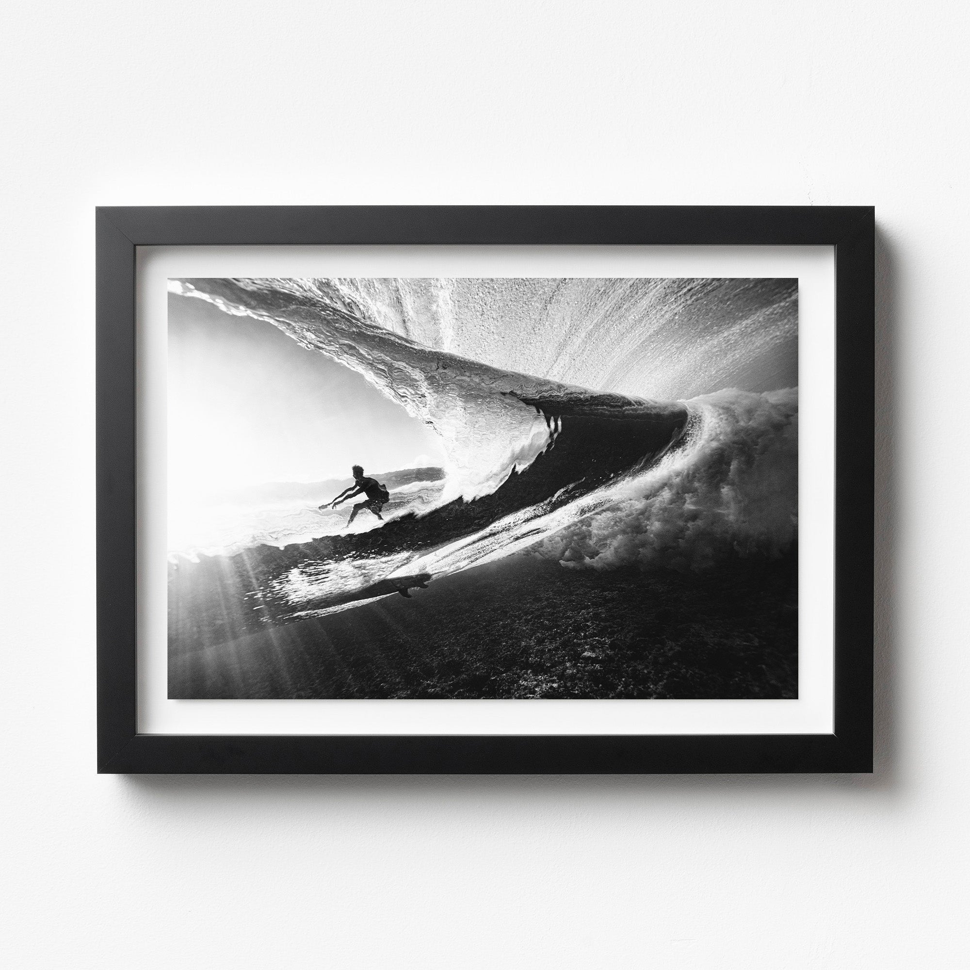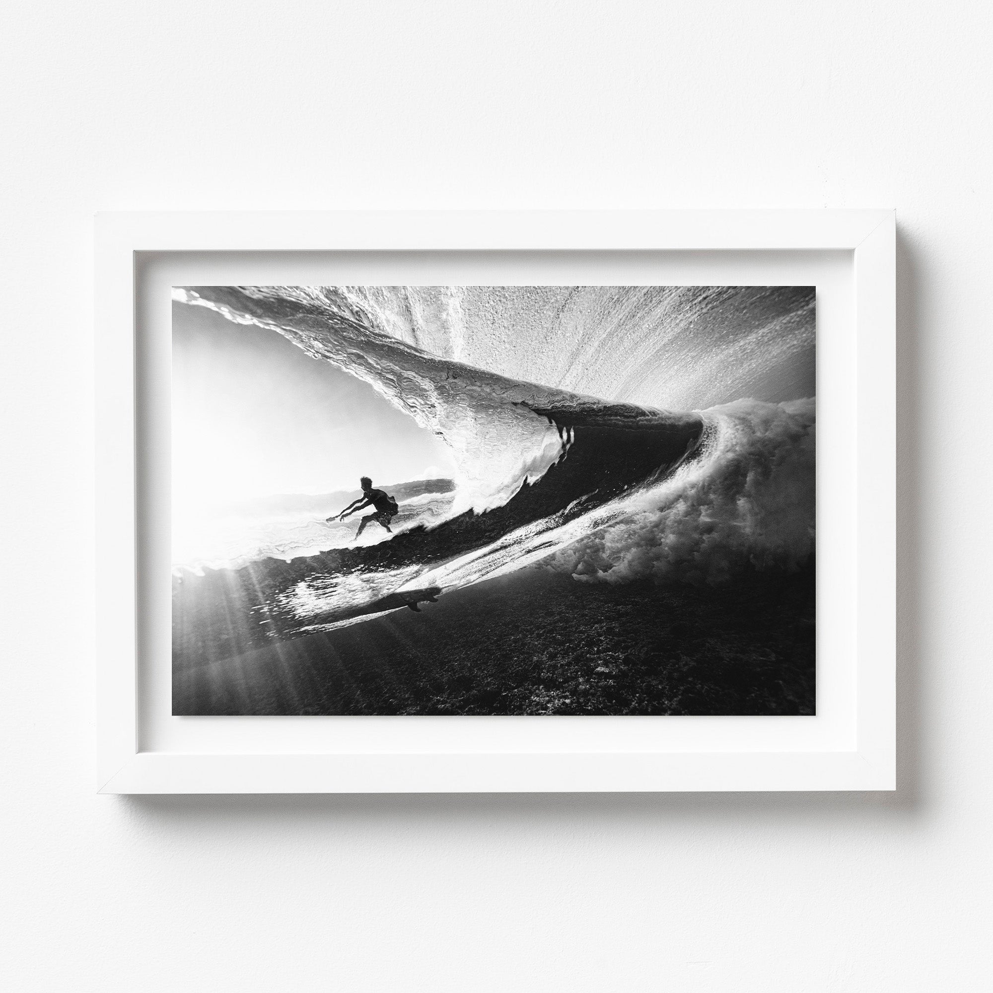 Glasshouse – Underwater Surf Photography Print. From the depths of the ocean, a mesmerizing sight unfolds as we gaze through the back of a wave. The world above is a tumultuous symphony of light and motion, with the sun's rays filtering through the water's surface in shimmering beams. Through the veil of the wave, we catch a surfer’s silhouette framed against the sky. Ideal for ocean-inspired interiors, underwater photography collectors, or those drawn to light, contrast, and the surreal perspective of surfing from below.