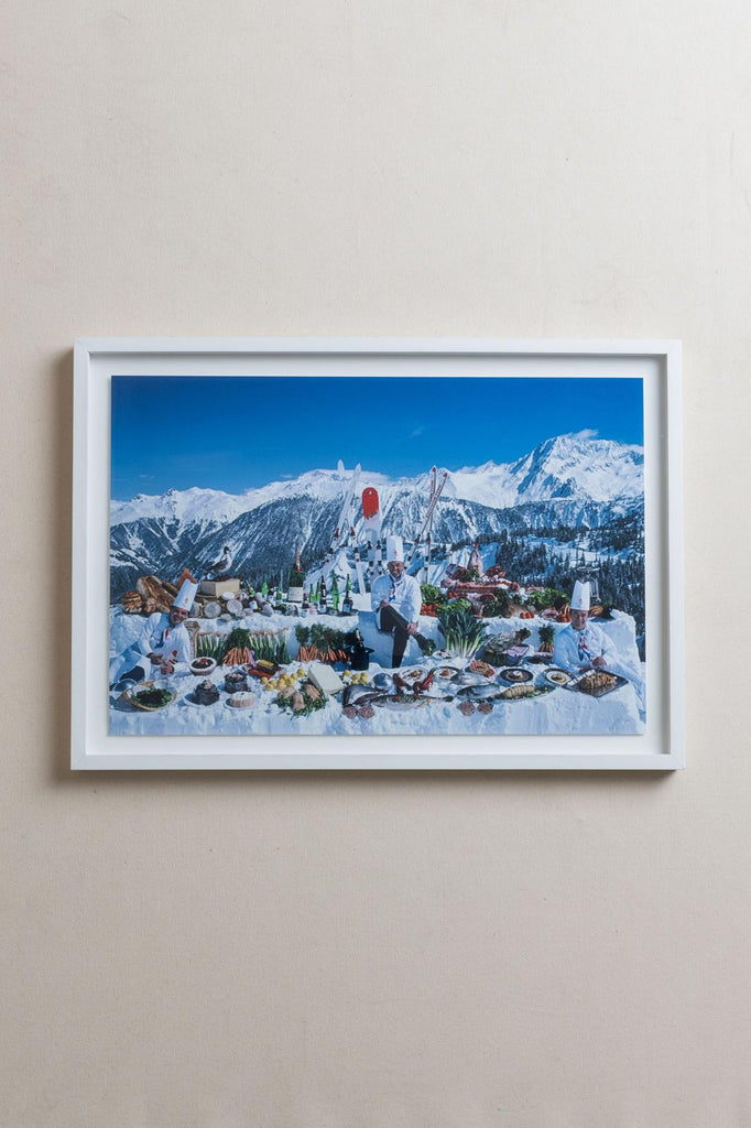 Culinary Heights – Courchevel, France, 1987. Published as a two-page spread in the February 1988 issue of Town & Country, this photograph captures the “culinary heights” of alpine dining. Featured are Courchevel’s convivial star chefs—Jean Jacob of Le Bateau Ivre, Michel Rochedy of Le Chabichou, and Albert Parveaux of Pralong 2000—posing amid an extravagant outdoor feast staged entirely on snow. Ideal for collectors of culinary photography, vintage editorial imagery, or anyone inspired by dramatic landscapes and French gastronomic culture.