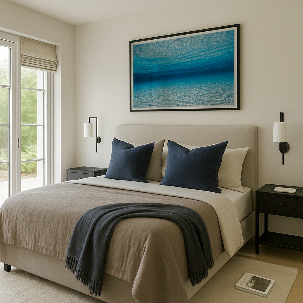 Ideal for coastal-inspired homes, bedroom sanctuaries, spa environments, or any space seeking a calming visual anchor. Its soft, expansive tones bring openness and tranquility to the room.