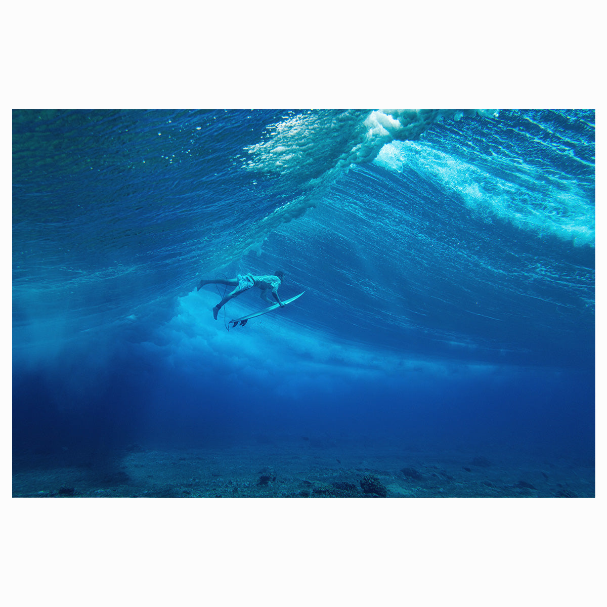 Captured beneath the surface at Nomotu Lefts in Fiji, this photograph freezes the raw energy of a surfer duck-diving under a powerful wave. The deep blues and cascading textures of the water create a cinematic sense of immersion, placing the viewer directly in the ocean’s pulse. This image celebrates the intimate connection between human presence and the untamed rhythm of the sea.