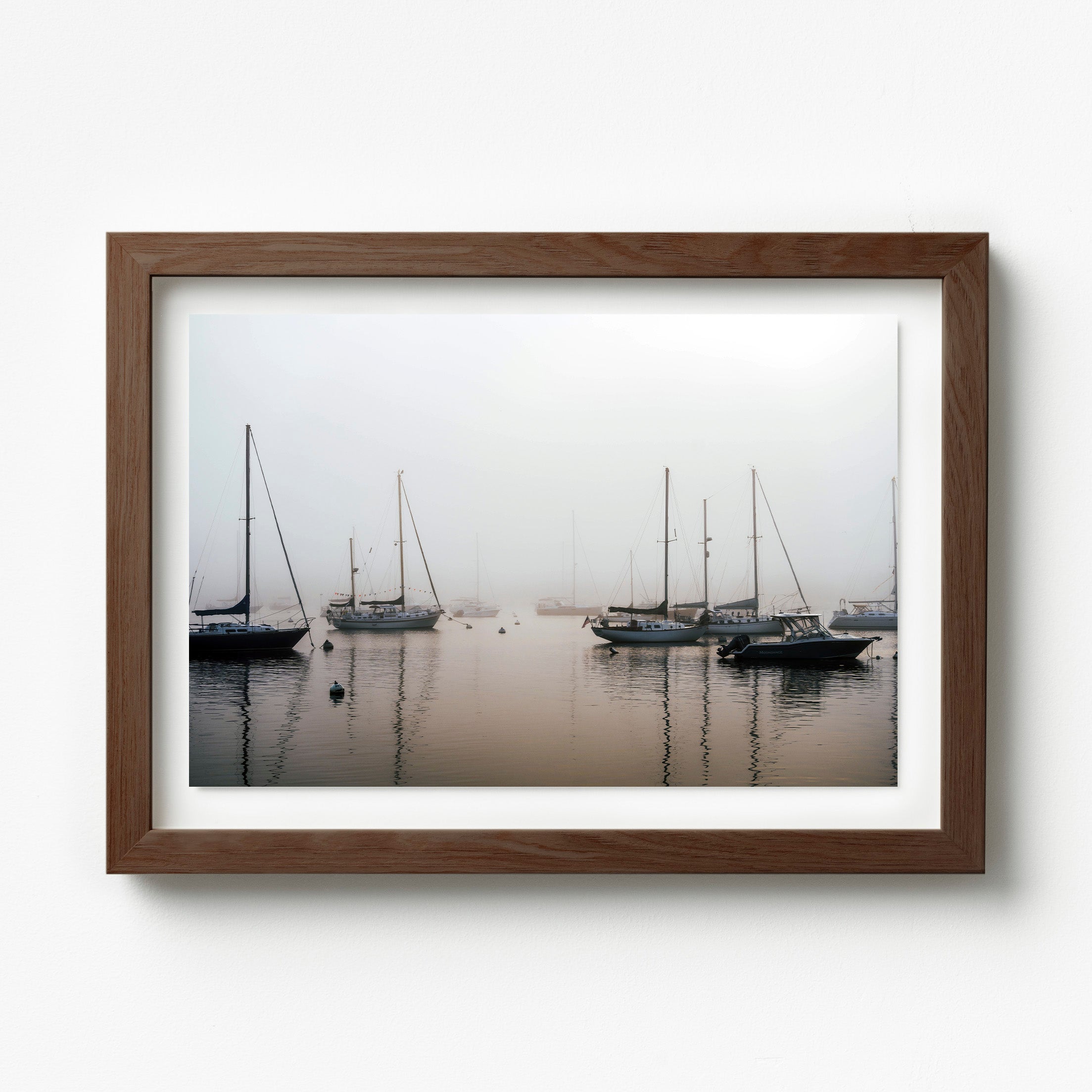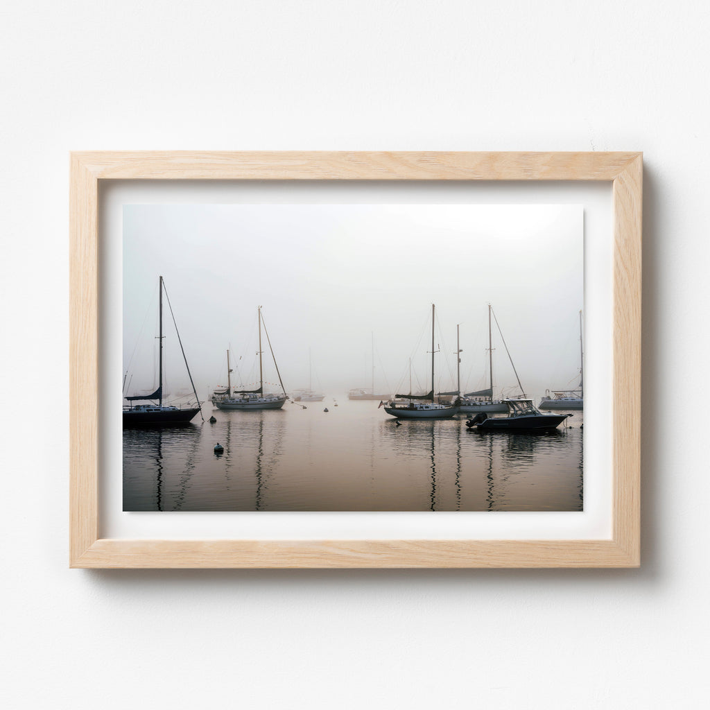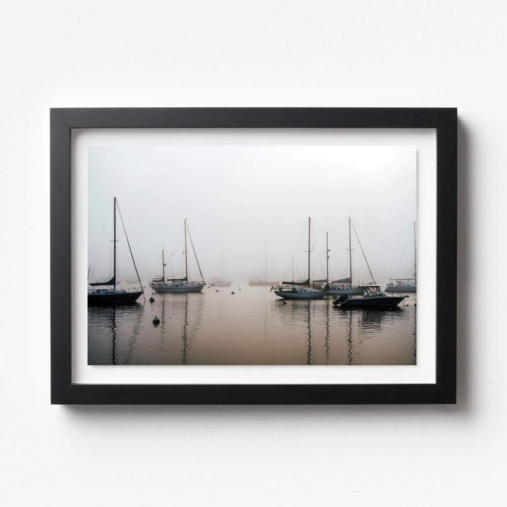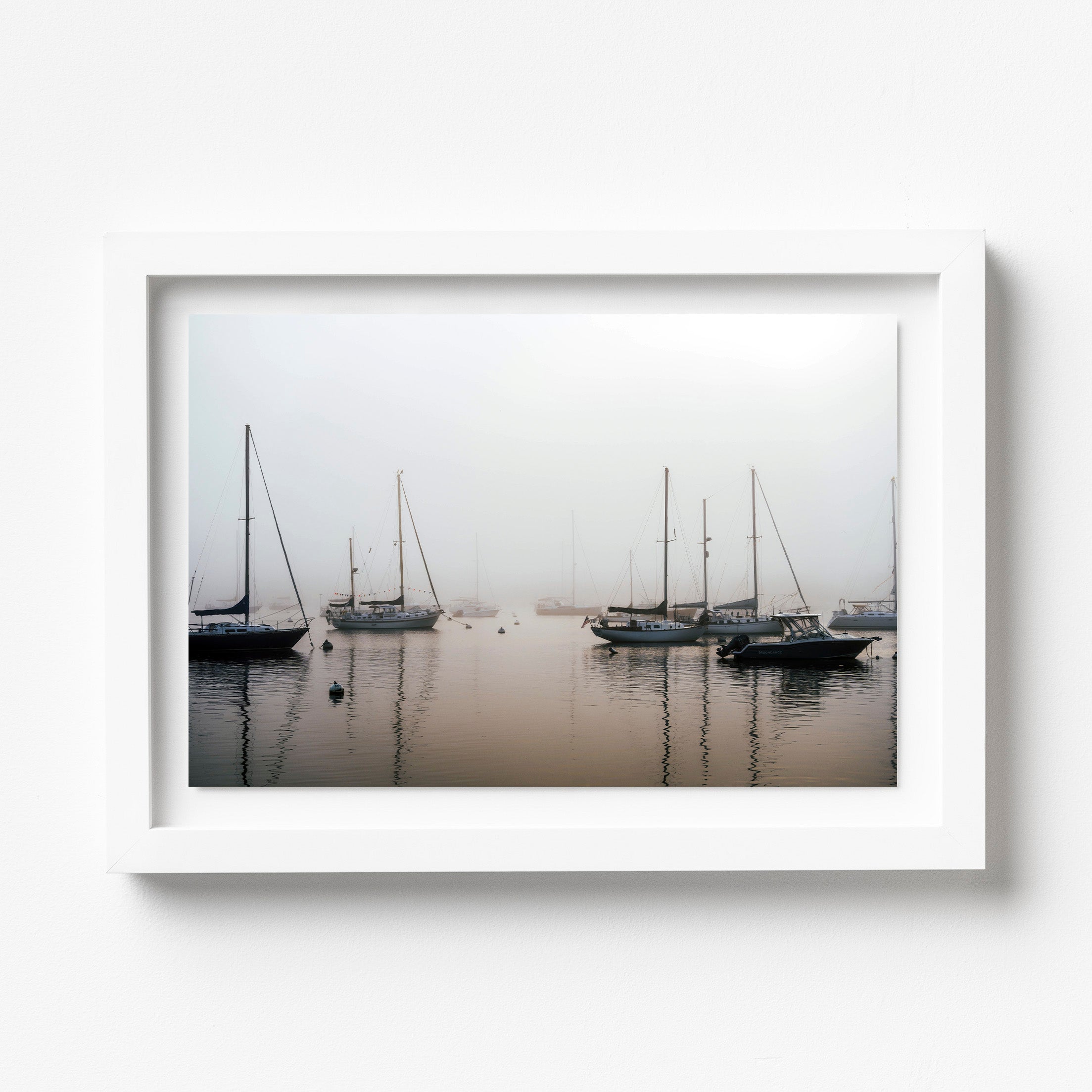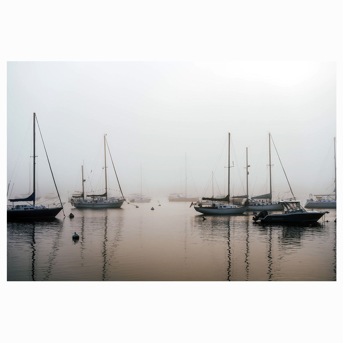 Captured in Chatham, Cape Cod, this photograph shows a harbor shrouded in the quiet stillness of early morning fog. The sailboats appear like silhouettes drifting in and out of view, their reflections stretching across the muted water. Taken just before heading out tuna fishing, it carries the weight of anticipation and the serenity of nature’s pause.