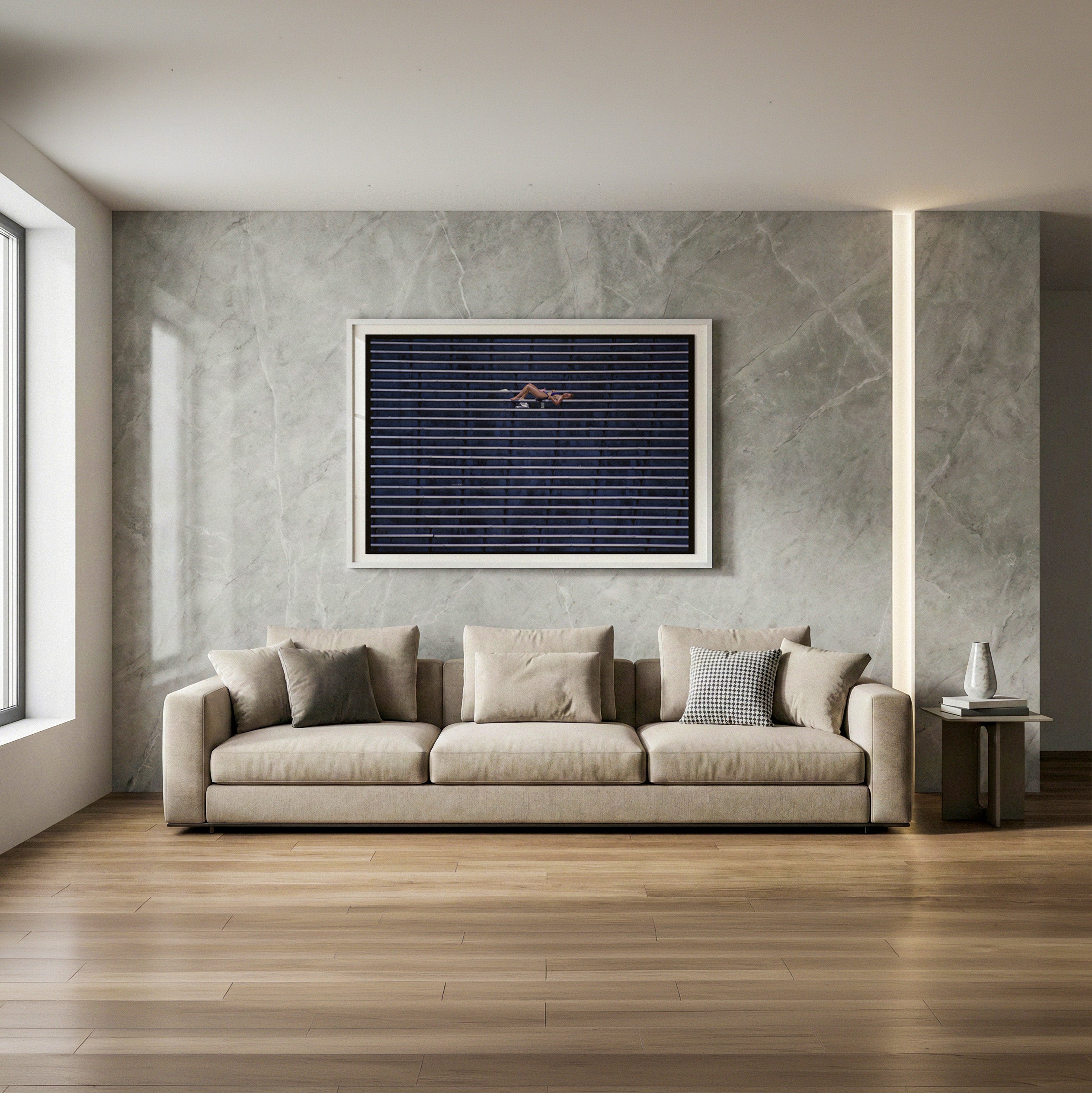Stadium Sunbathing – Minimalist Leisure Photography Print. In this poignant image, a lone woman reclines on bleachers, basking in sunlight, as if engaged in a solitary dialogue with the space around her. The composition captures a moment of serene introspection, emphasizing the interplay of solitude and leisure. Photographed in a quiet stadium, the scene transforms a typically loud and crowded setting into something calm and personal. An ideal fit for minimalist interiors, creative studios, or modern spaces with an appreciation for quiet and form.
