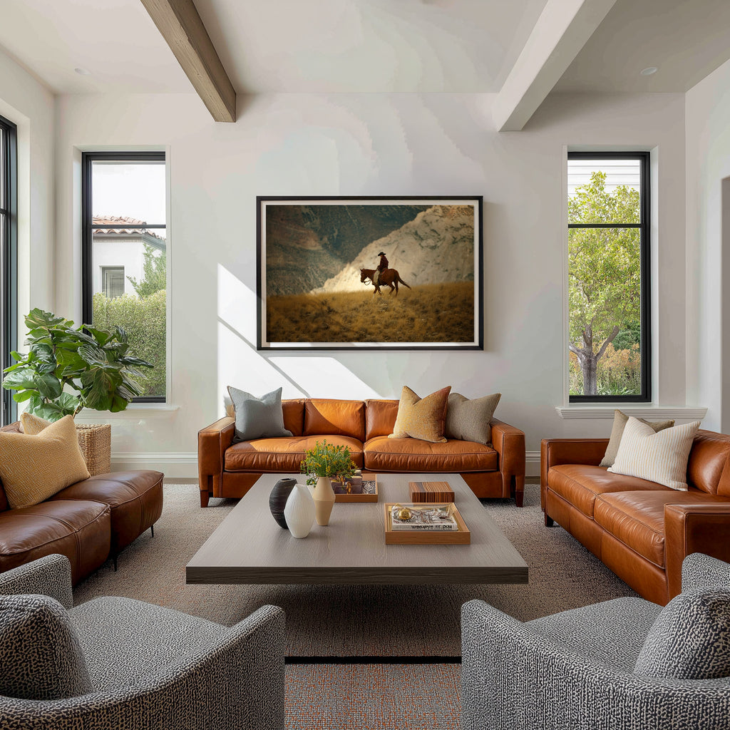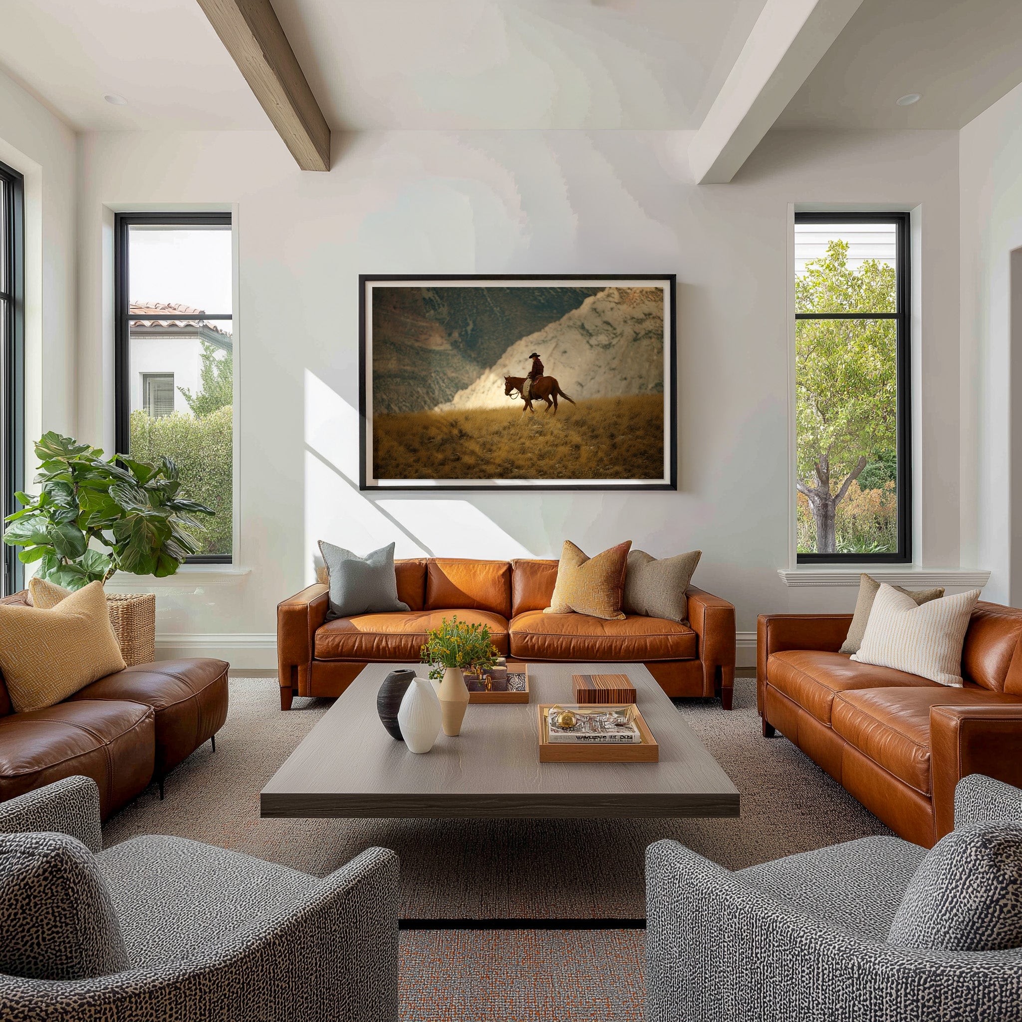 Horseback Rider – Premium Western Photography Print. This evocative image portrays a solitary rider astride a horse, set against a dramatic natural backdrop. The light, posture, and environment combine to evoke themes of freedom, solitude, and the timeless bond between human and animal. Ideal for living rooms, studies, or gallery walls seeking a sense of calm and movement. It brings a refined, contemplative energy to minimalist or nature-inspired spaces.