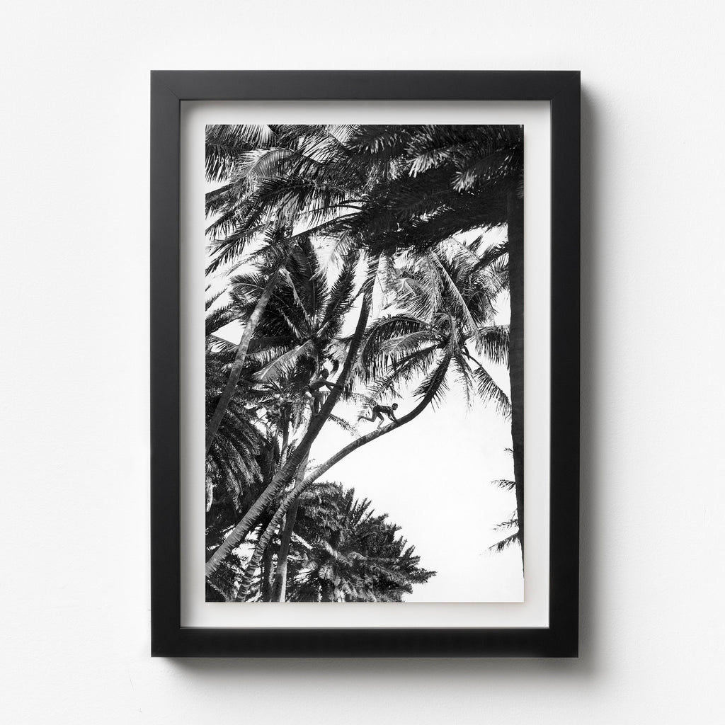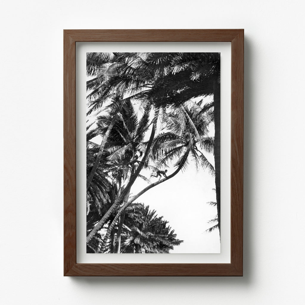 Boys Climbing Coconut Trees – Vintage Hawaiian Photography Print, 1940. This striking black-and-white image from circa 1940 showcases young boys climbing coconut palms against a backdrop of sunlit fronds in Honolulu, Hawaii. Their silhouettes and natural movement reflect the carefree energy and connection to nature that define island culture. The photograph’s bold vertical framing and organic texture bring depth and authenticity to any space. Perfect for coastal interiors, tropical-inspired rooms, or collectors of classic travel photography — a timeless tribute to Hawaii’s vibrant spirit and playful charm.