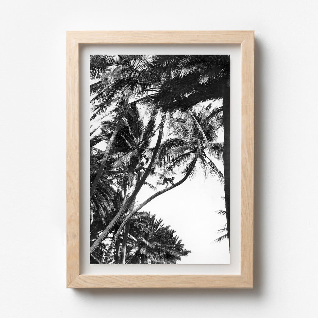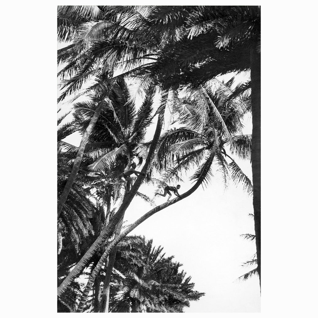 A dynamic mid-century photograph capturing the agility and playfulness of boys scaling tall coconut trees in Honolulu, Hawaii. The upward composition and swaying palms convey both adventure and island life’s easy rhythm, evoking the warmth and vitality of tropical youth.