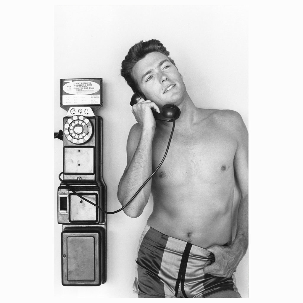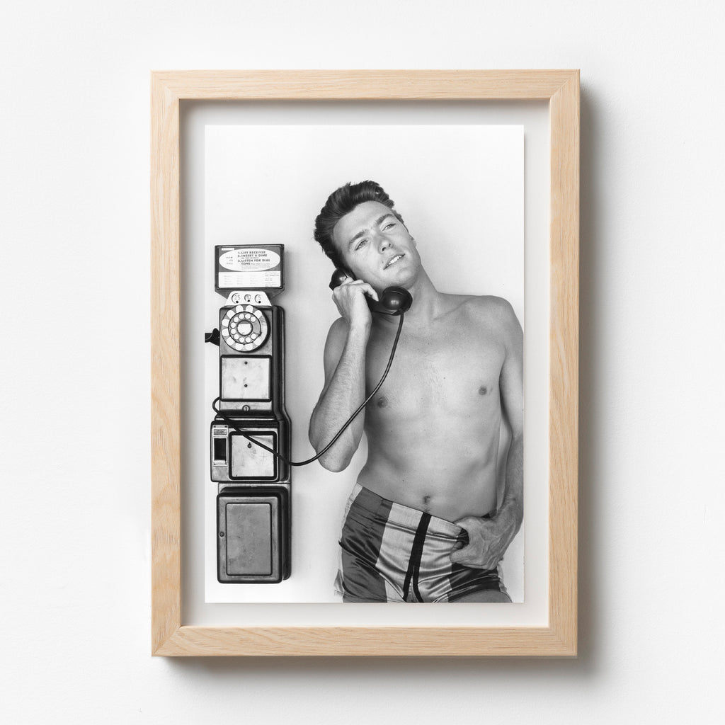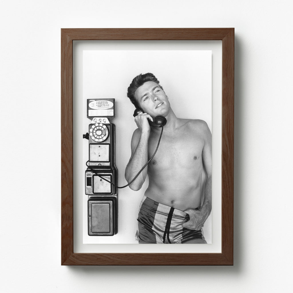 Clint Eastwood Takes A Call – Archival Photography Print, California, 1956. Actor Clint Eastwood talks on a pay phone outside his home on June 1, 1956, in Los Angeles, California. This striking black-and-white photograph captures Eastwood early in his career, exuding the confidence and ease that would later define his iconic screen presence. Set against the clean lines and simple geometry of 1950s design, the image reflects the laid-back glamour of postwar Los Angeles. Ideal for film enthusiasts, collectors of Hollywood history, or anyone drawn to timeless portraiture, this print embodies effortless charisma and vintage American style.