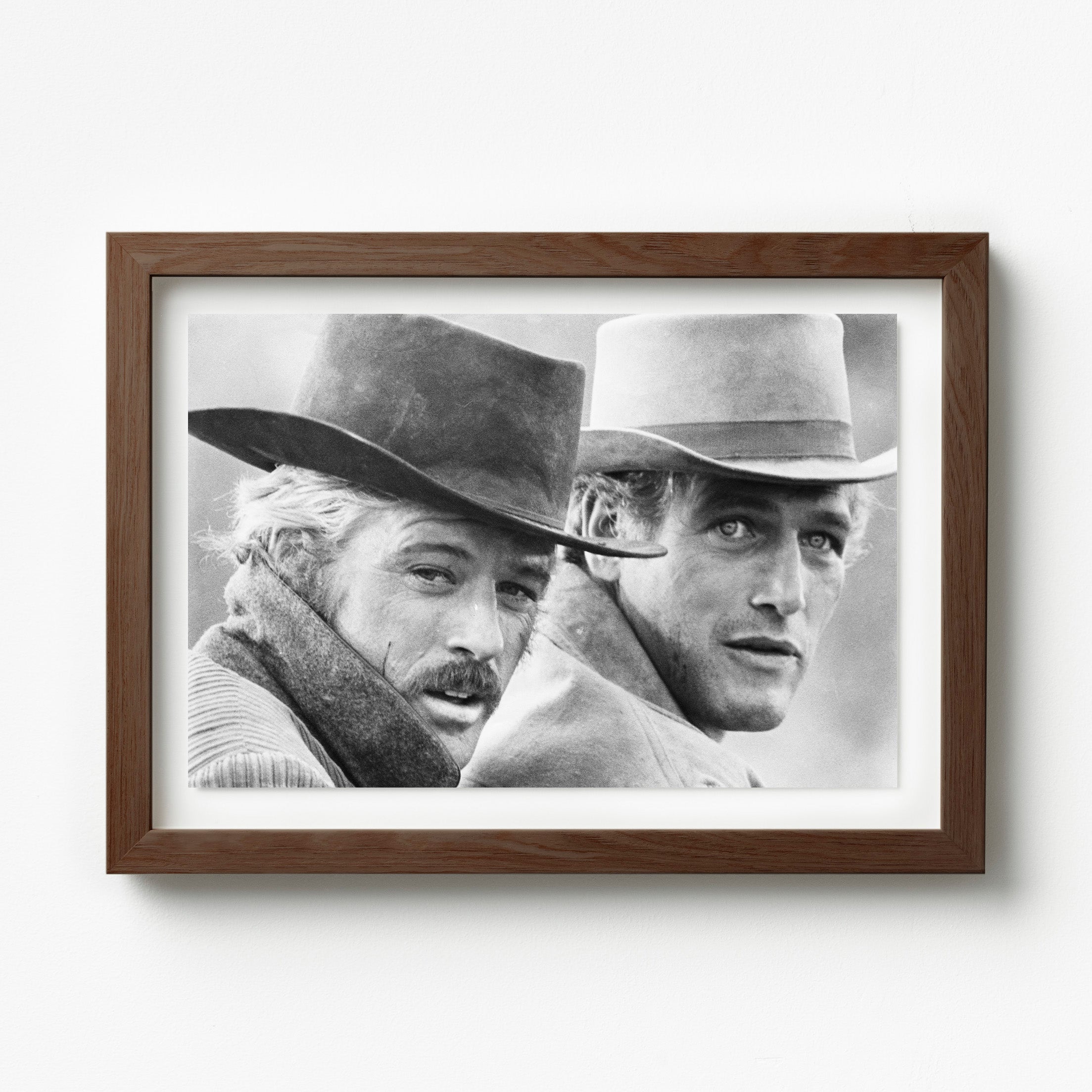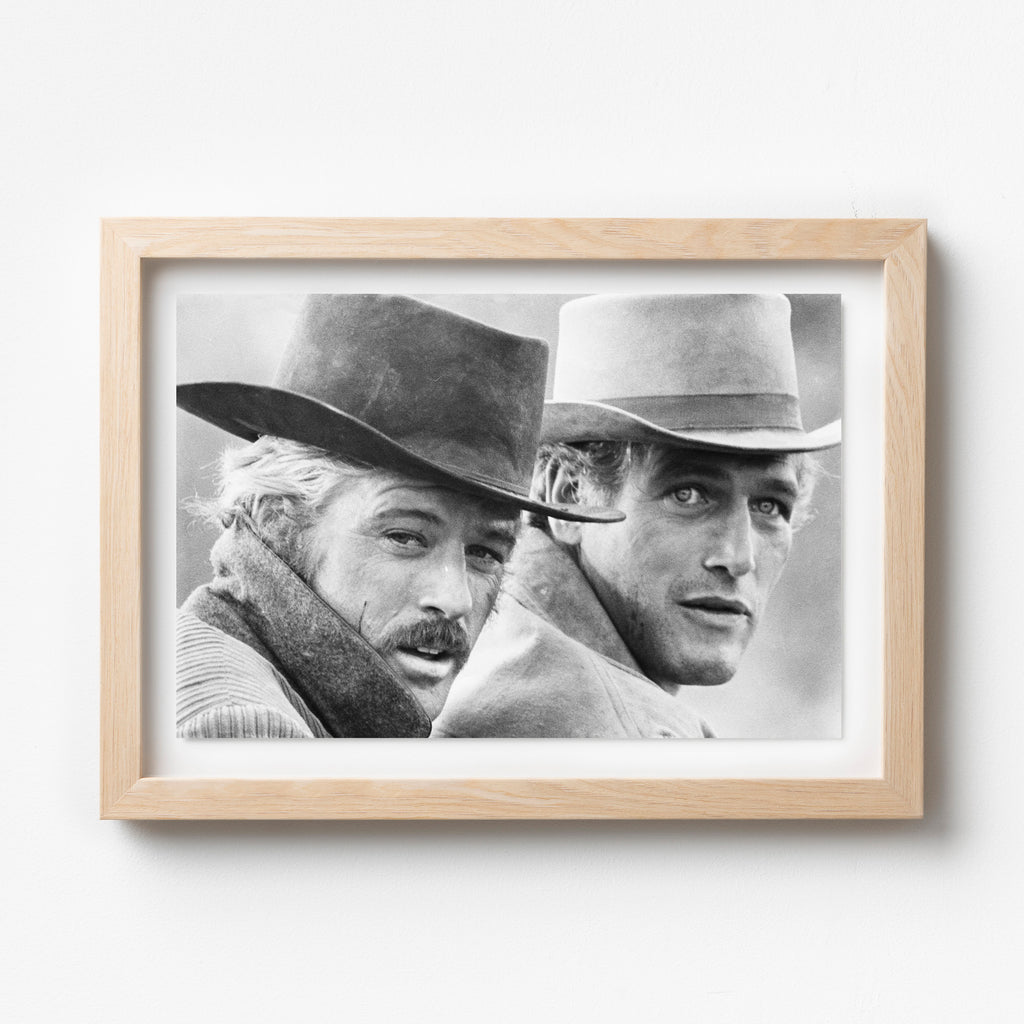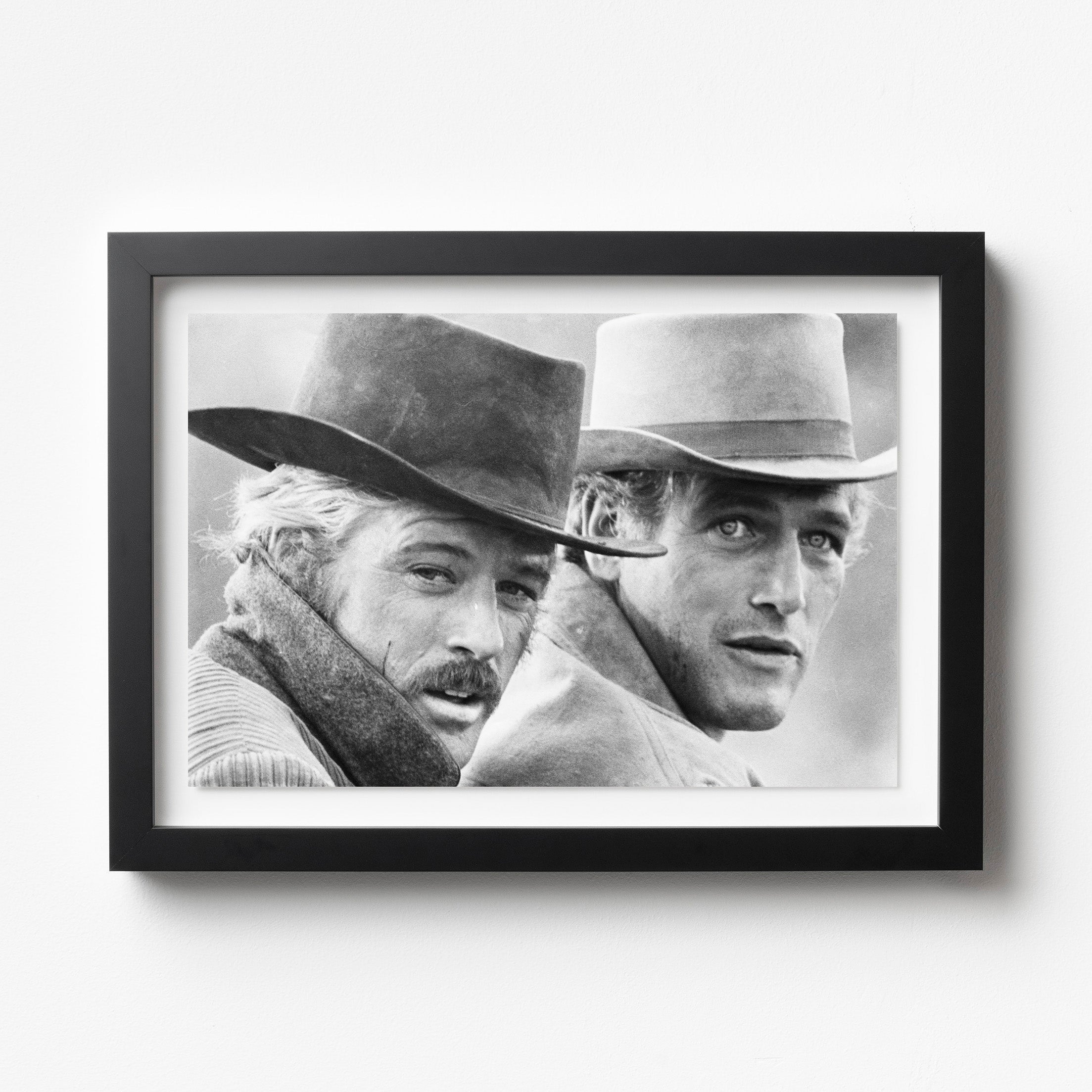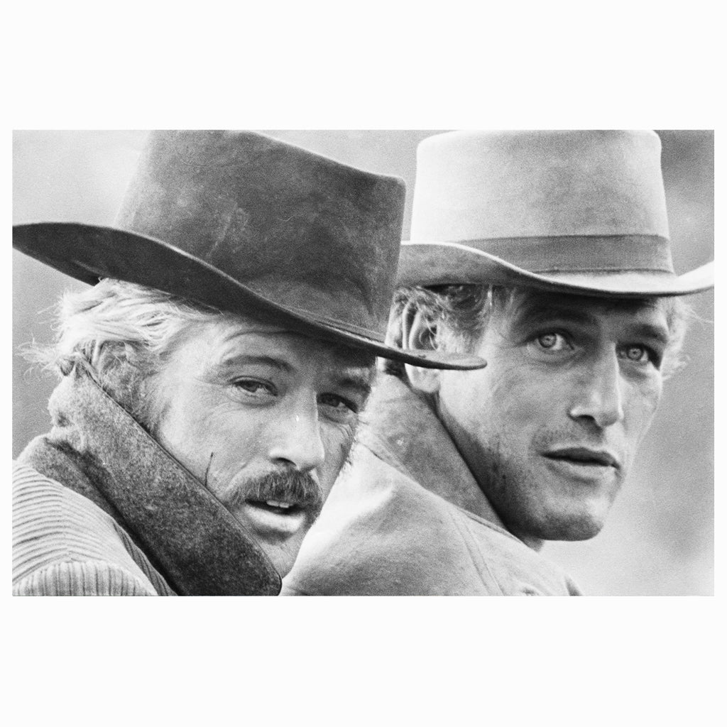 Butch Cassidy and the Sundance Kid – Classic Film Photography Print, 1969. This archival photograph features Robert Redford (left) as the Sundance Kid and Paul Newman as Butch Cassidy in a scene from the 1969 Western masterpiece Butch Cassidy and the Sundance Kid. Captured in timeless black and white, the image highlights the film’s iconic partnership and rugged Western aesthetic. A perfect piece for collectors of classic cinema, Hollywood history, or vintage portraiture — this photograph embodies the charisma, friendship, and cinematic style of late-1960s American filmmaking.