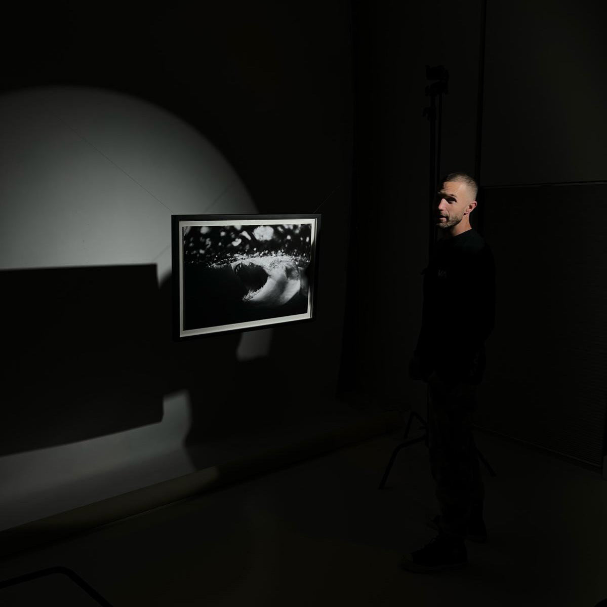 Jaws – Black and White Great White Shark Photography Print, South Africa. "Great white shark encounter. South Africa." Shot just beneath the surface, this rare moment captures the raw intensity of a great white shark mid-strike. The monochrome tones emphasize texture and power, turning a flash of movement into a dramatic, almost sculptural composition. Ideal for bold interiors, wildlife enthusiasts, or collectors of shark photography, underwater black and white prints, or striking ocean predator imagery.