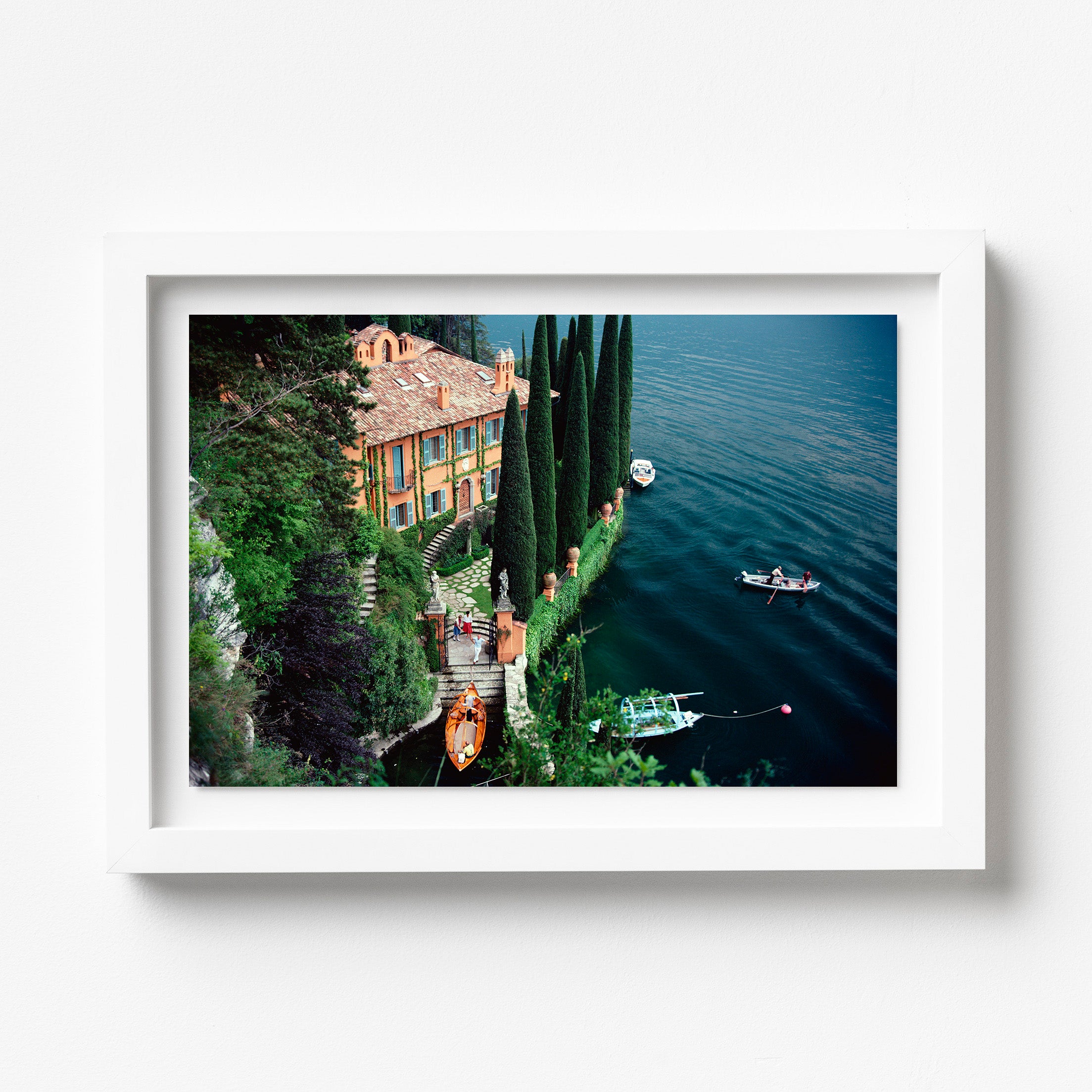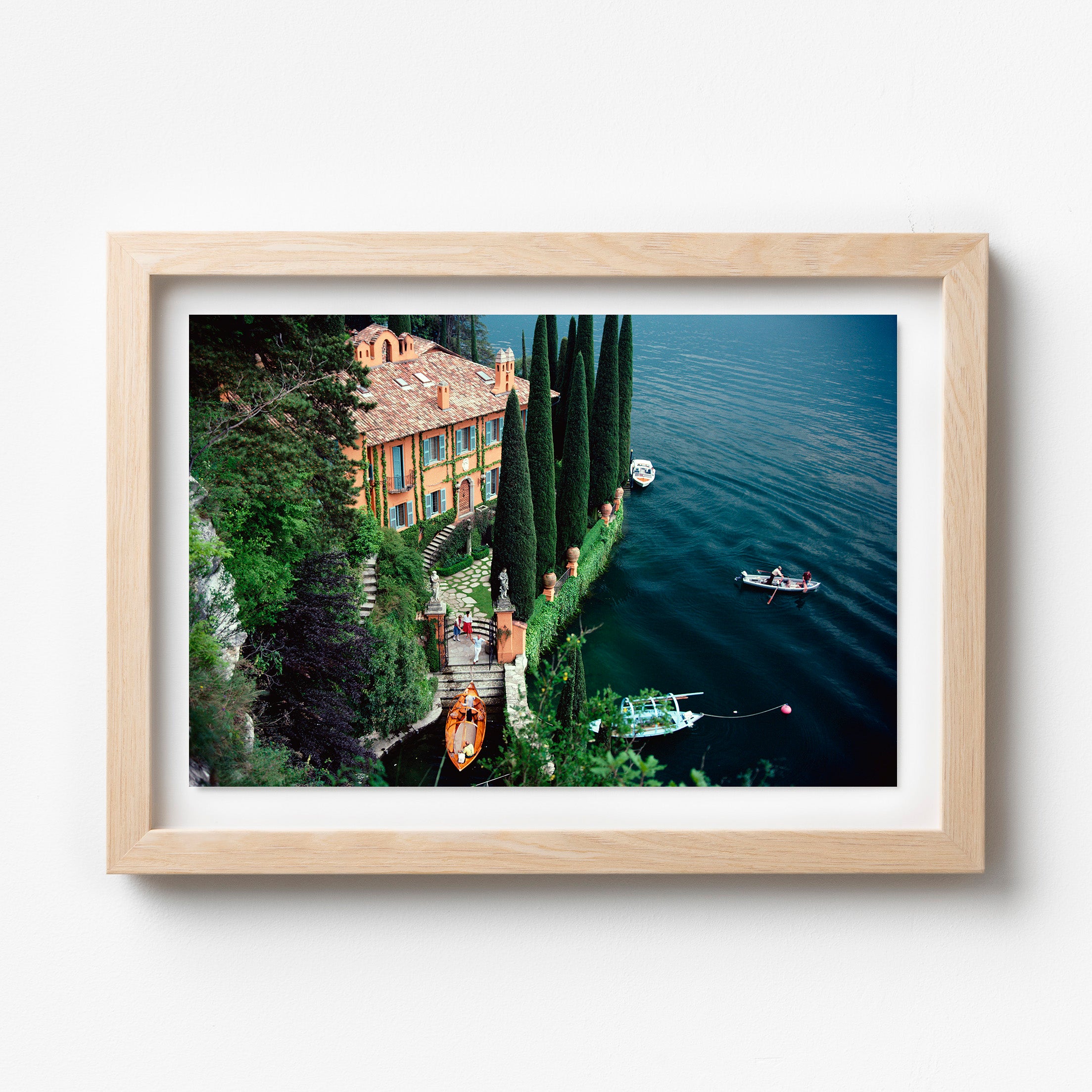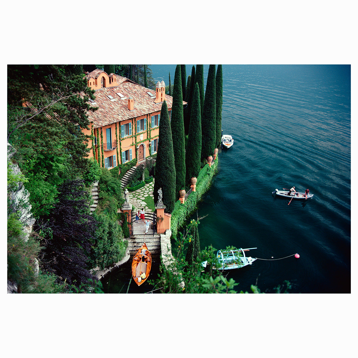 Giacomo Mantegazza – Fine Art Coastal Photography Print, Italy. Giacomo and Stefania Mantegazza welcome guests arriving by boat at their villa, La Cassinella, on Lake Como, 1983.  This photograph captures a moment of classic Italian hospitality, highlighting the seamless blend of historic architecture and the serene, deep blues of the water. It stands as a striking study of Mediterranean leisure, freezing the refined and sun-drenched spirit of a vintage summer in Lombardy.  With its nostalgic charm and architectural grandeur, this print brings a sense of quiet luxury and historic character to any interior. Its lush greens and iconic subject matter make it an ideal focal point for airy living rooms, classic studies, or spaces seeking a touch of old-world European glamour.