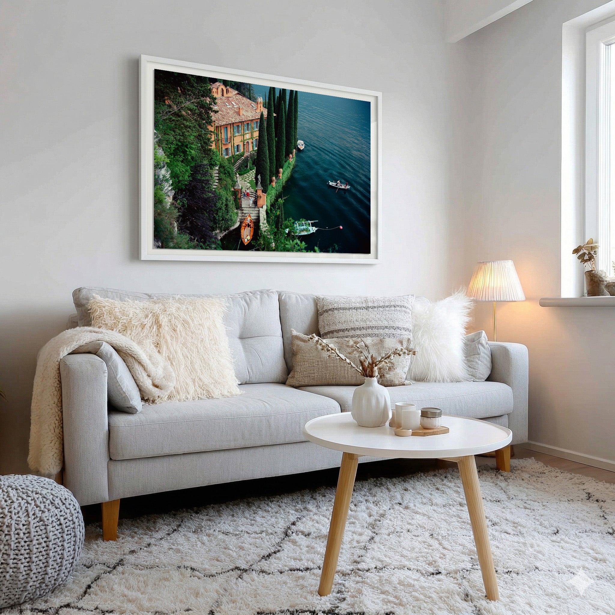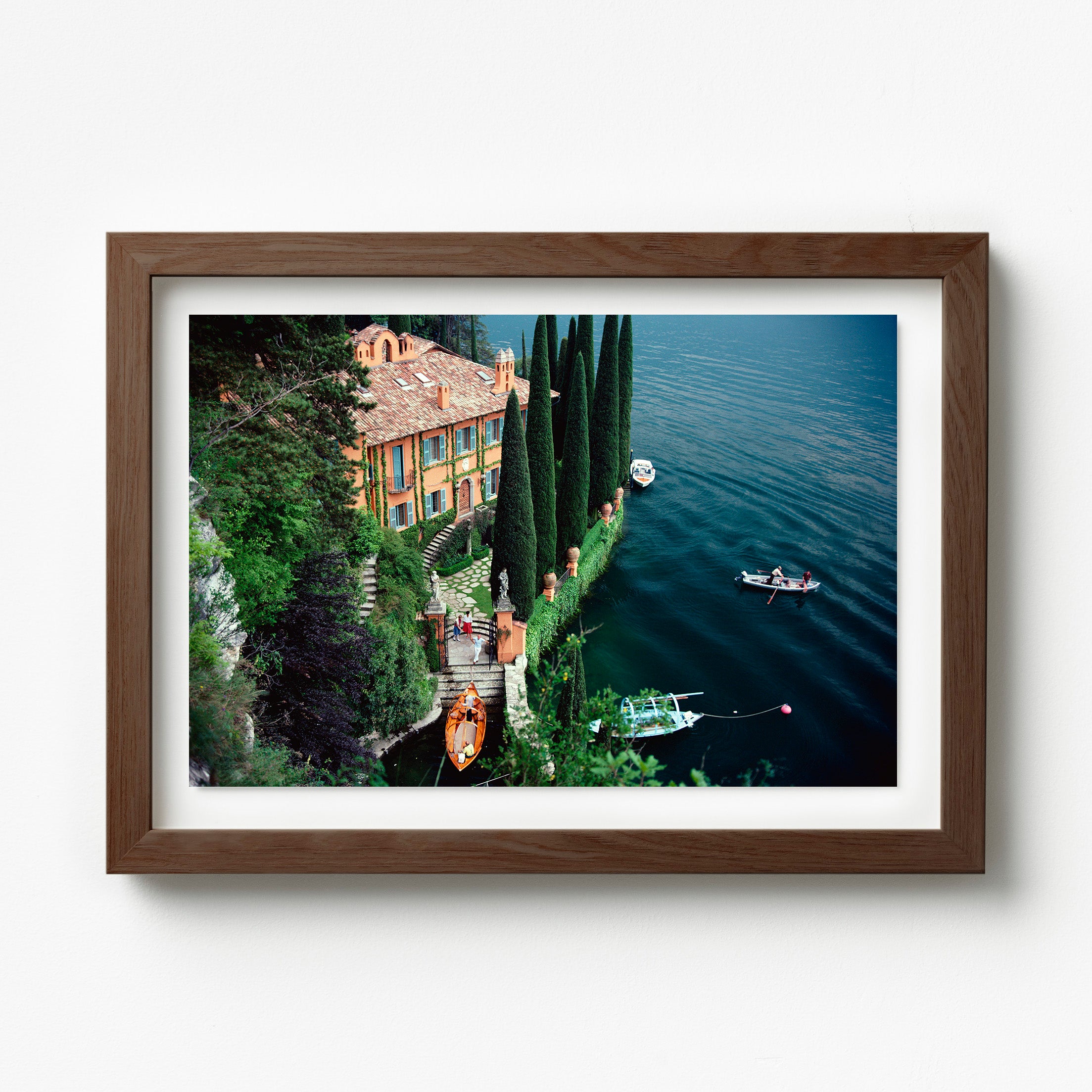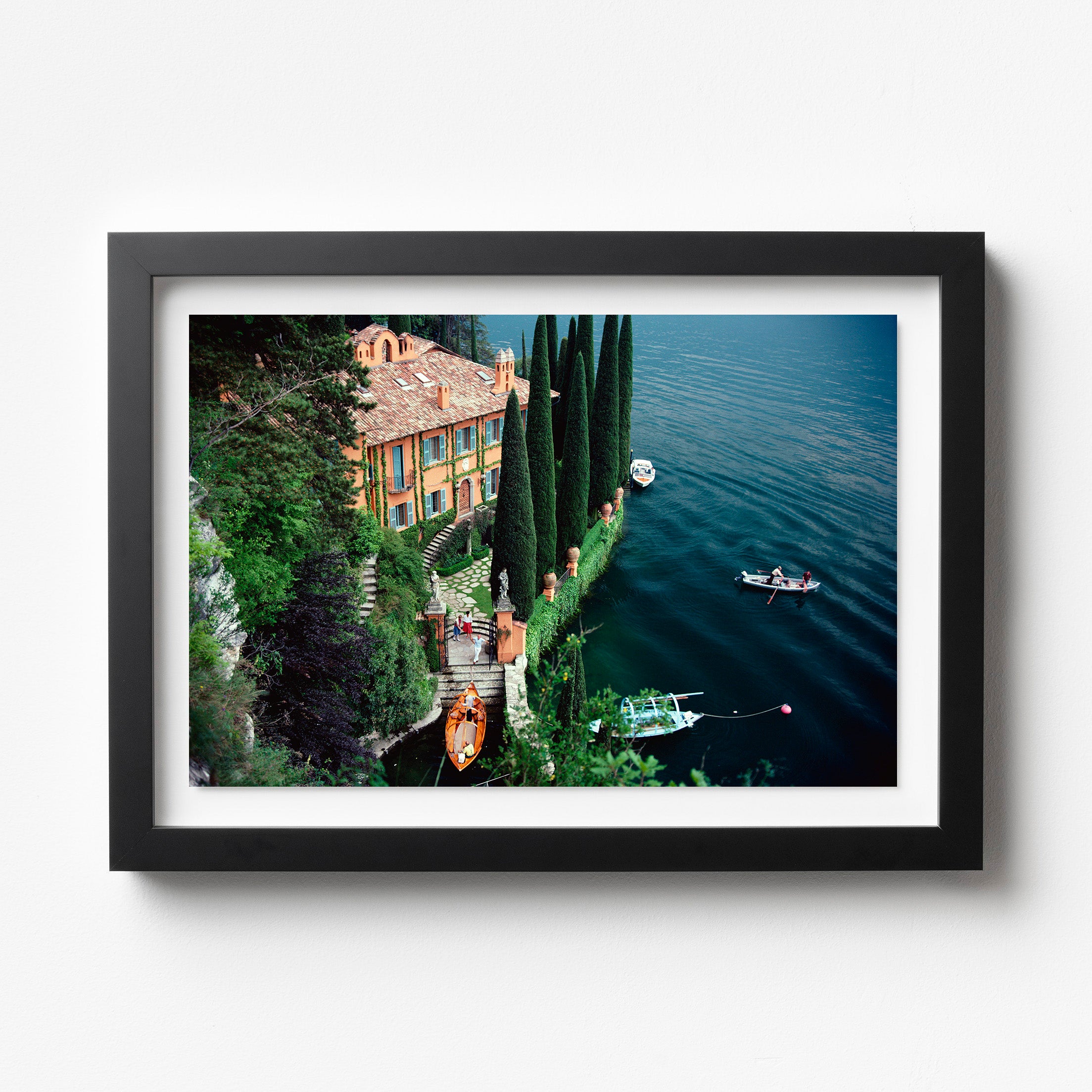 Giacomo Mantegazza – Fine Art Coastal Photography Print, Italy. Giacomo and Stefania Mantegazza welcome guests arriving by boat at their villa, La Cassinella, on Lake Como, 1983.  This photograph captures a moment of classic Italian hospitality, highlighting the seamless blend of historic architecture and the serene, deep blues of the water. It stands as a striking study of Mediterranean leisure, freezing the refined and sun-drenched spirit of a vintage summer in Lombardy.  With its nostalgic charm and architectural grandeur, this print brings a sense of quiet luxury and historic character to any interior. Its lush greens and iconic subject matter make it an ideal focal point for airy living rooms, classic studies, or spaces seeking a touch of old-world European glamour.