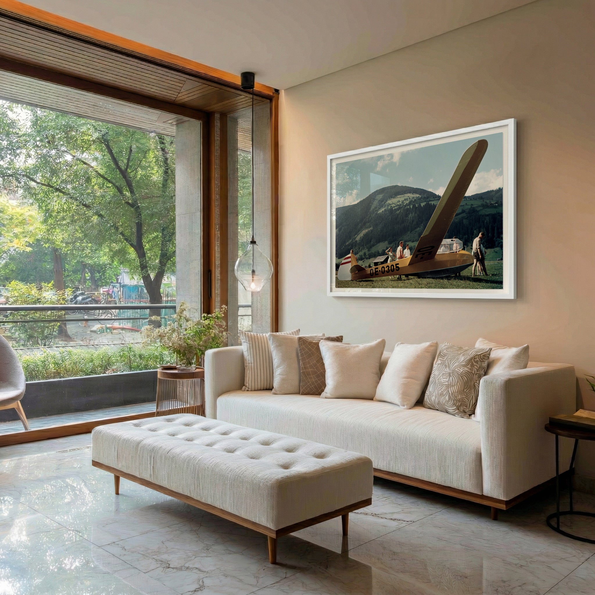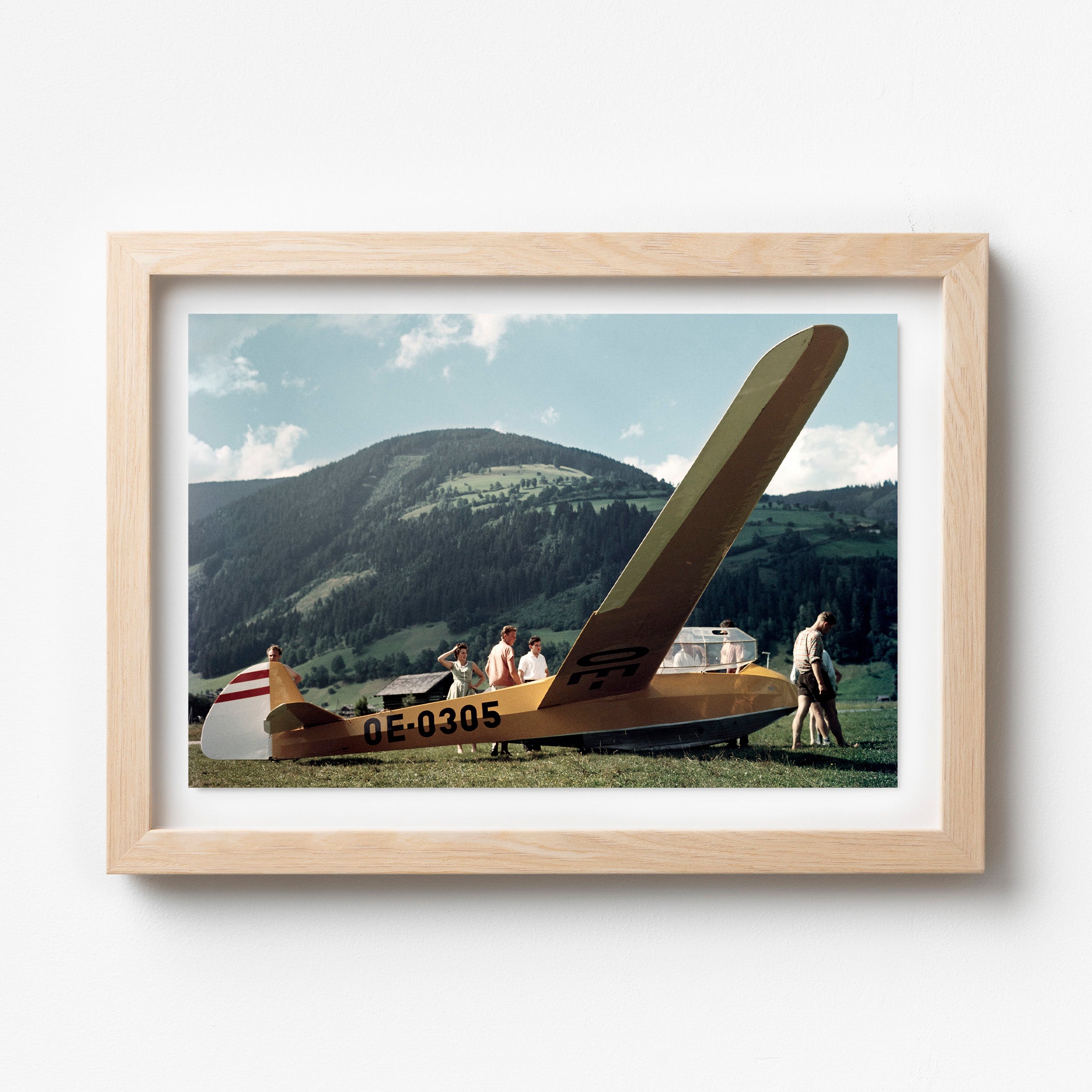 Mittersill Castle – Fine Art Mountain Photography Print, Austria. A glider rests on the ground by Mittersill Castle, Austria, 1958. This photograph captures a moment of serene, high-altitude elegance, highlighting the striking contrast between the aerodynamic lines of the sailplane and the storied stone architecture of the castle. It stands as a timeless portrayal of mid-century luxury, freezing the crisp and adventurous spirit of a vintage European winter. The expansive mountain backdrop and soft alpine light bring a sense of fresh air and quiet grandeur to any interior. This piece serves as a sophisticated statement in a private study, modern living space, or gallery, offering a unique balance of historical charm and a calm, scenic atmosphere.
