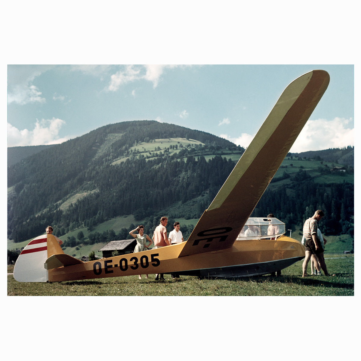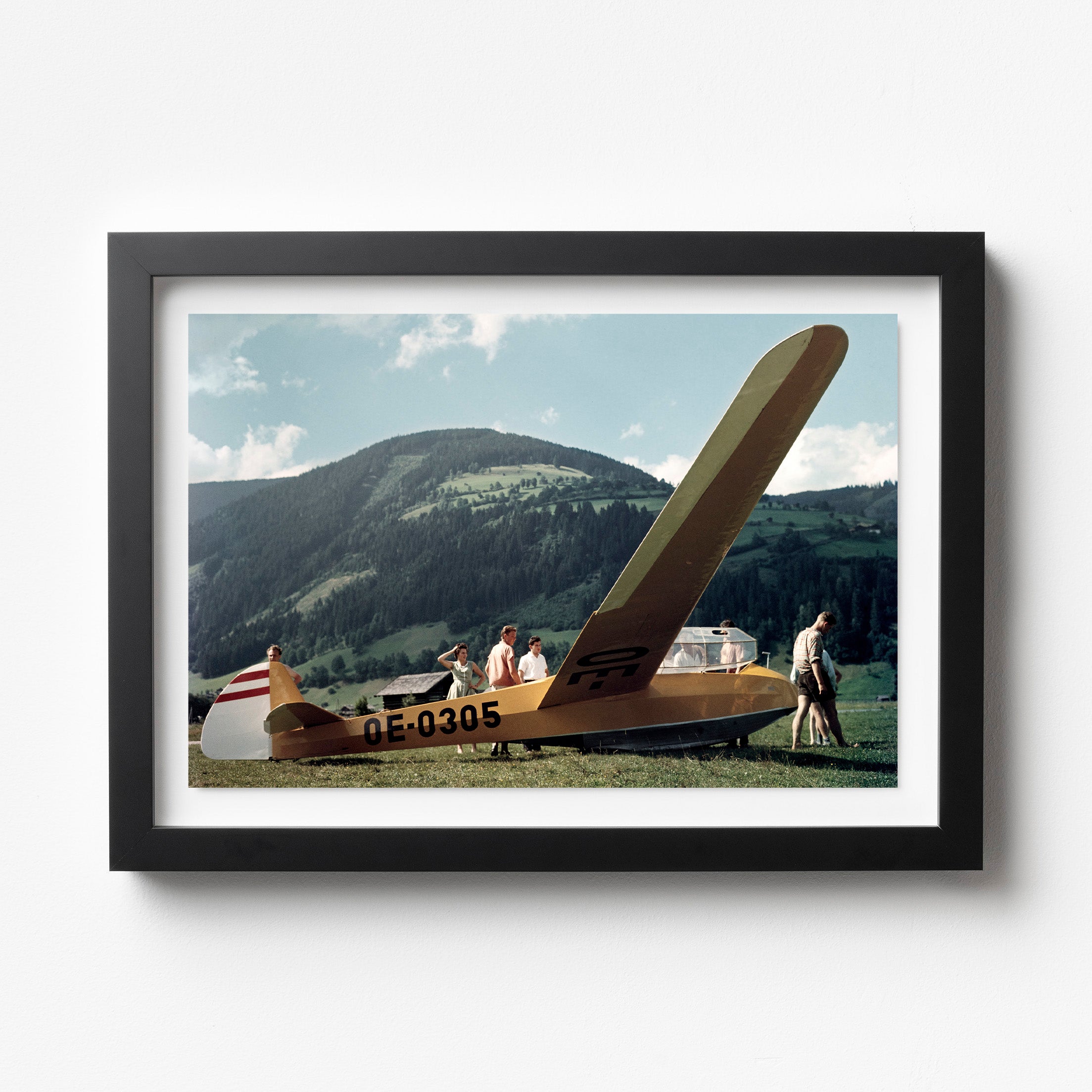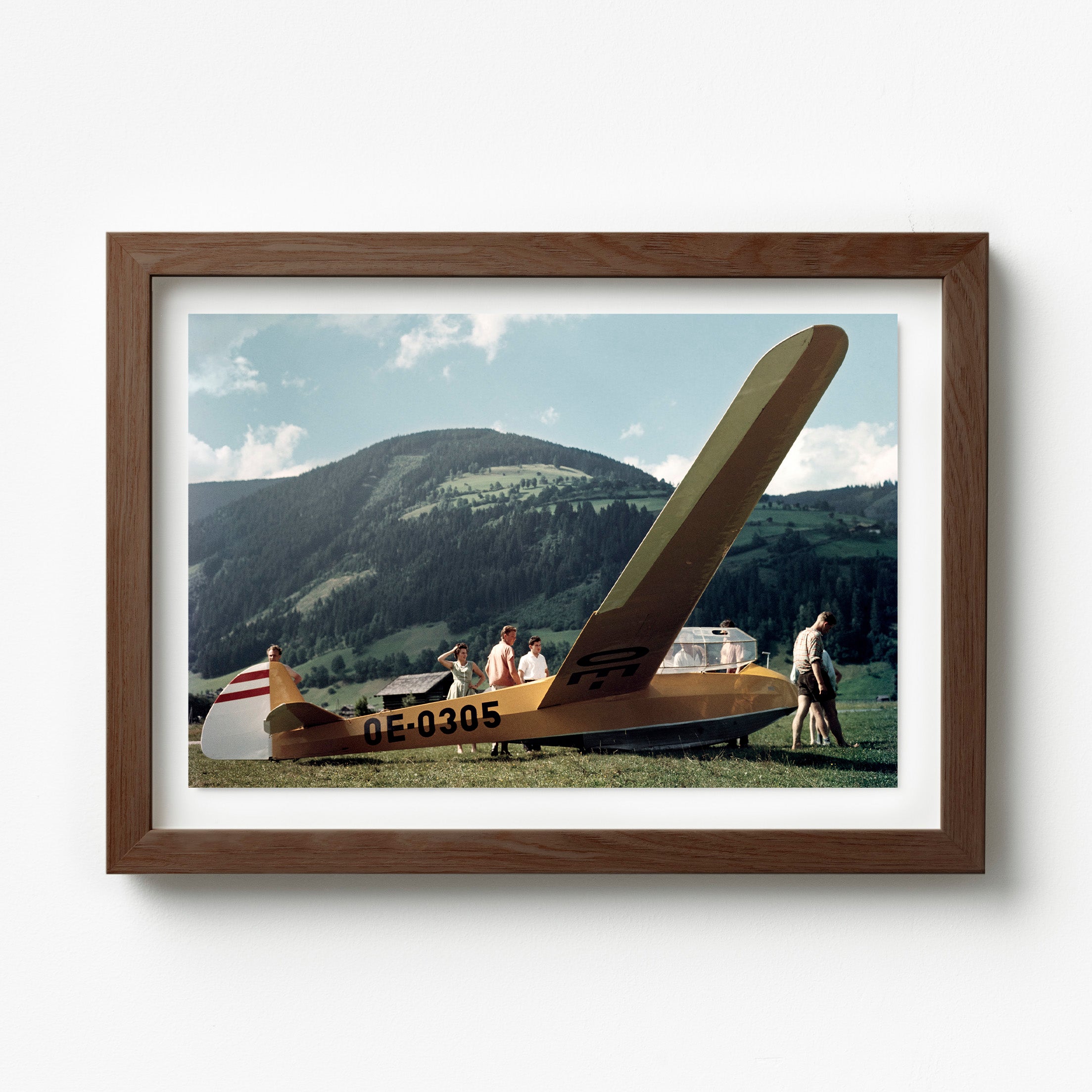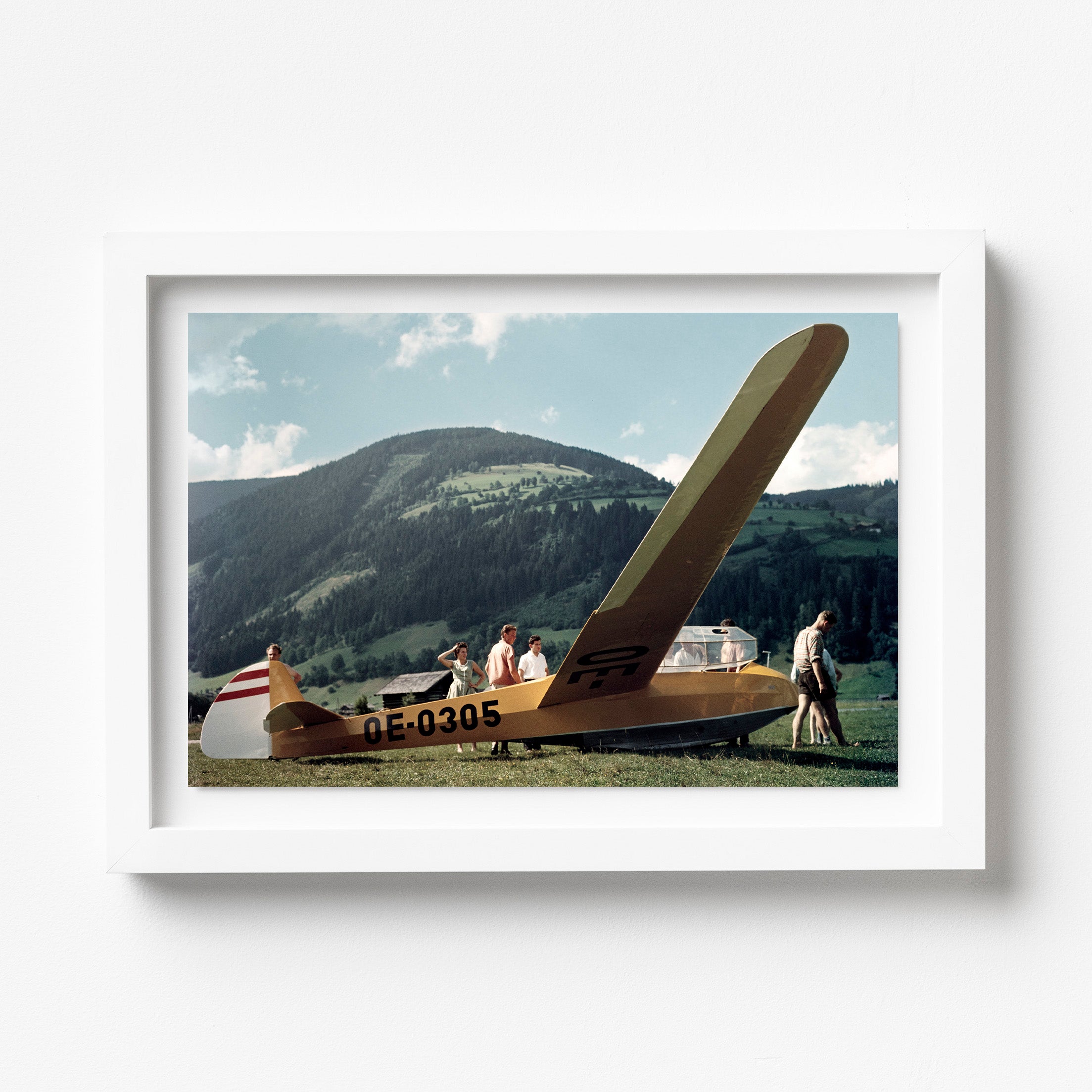 Mittersill Castle – Fine Art Mountain Photography Print, Austria. A glider rests on the ground by Mittersill Castle, Austria, 1958. This photograph captures a moment of serene, high-altitude elegance, highlighting the striking contrast between the aerodynamic lines of the sailplane and the storied stone architecture of the castle. It stands as a timeless portrayal of mid-century luxury, freezing the crisp and adventurous spirit of a vintage European winter. The expansive mountain backdrop and soft alpine light bring a sense of fresh air and quiet grandeur to any interior. This piece serves as a sophisticated statement in a private study, modern living space, or gallery, offering a unique balance of historical charm and a calm, scenic atmosphere.