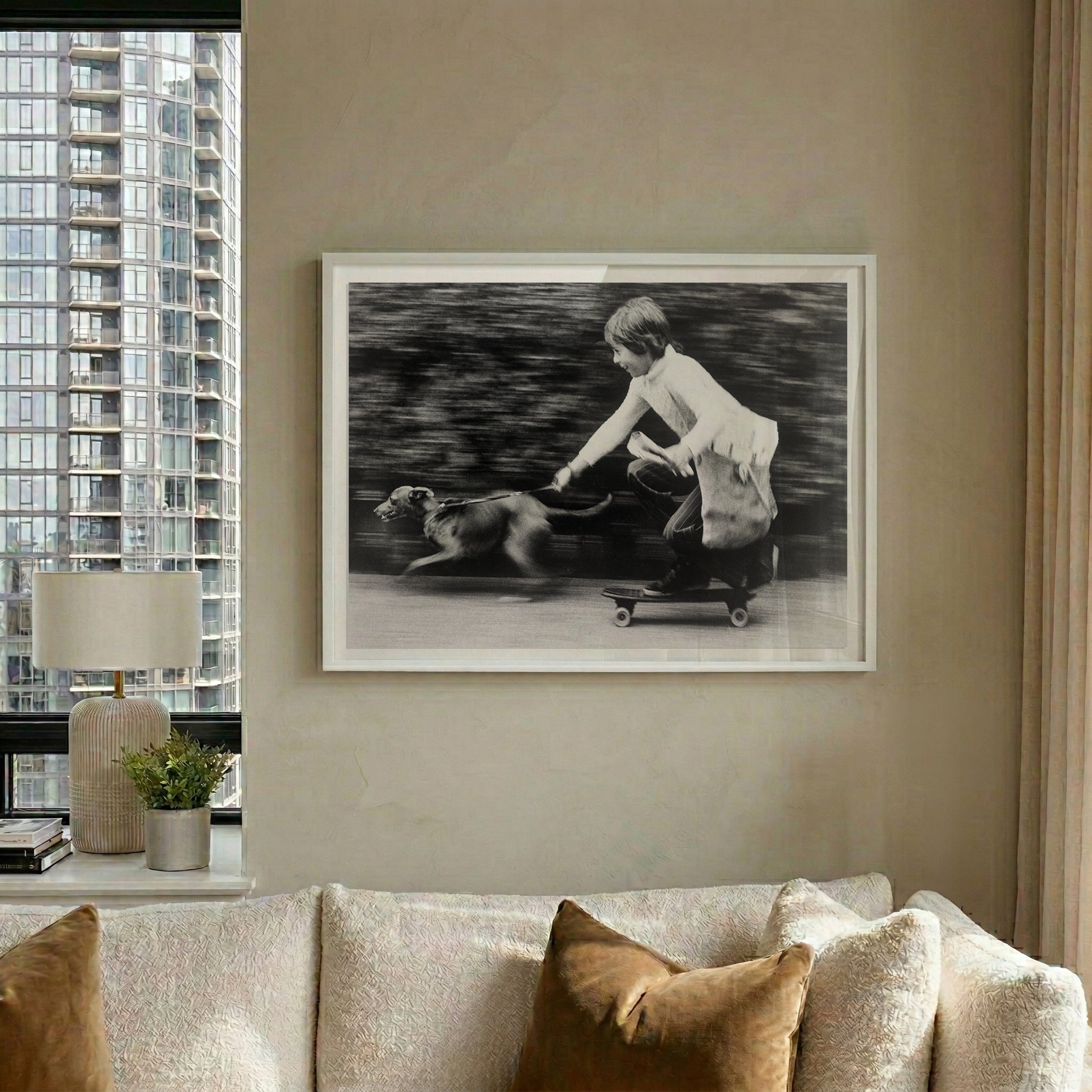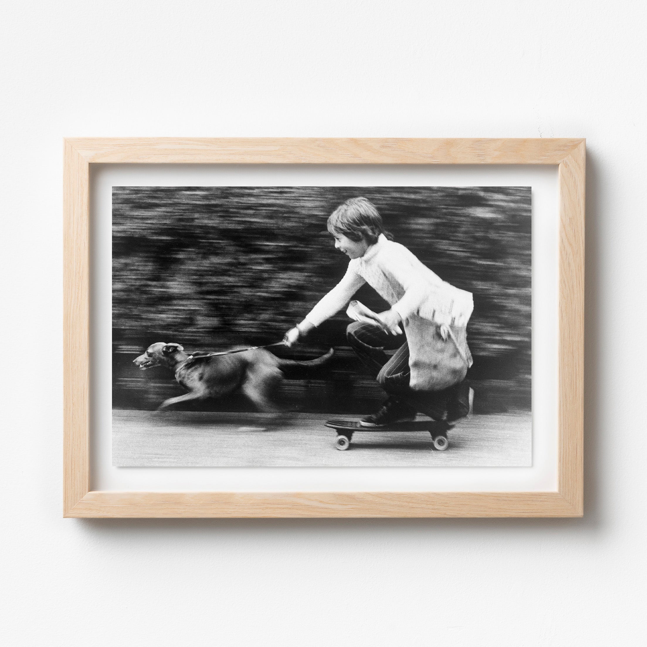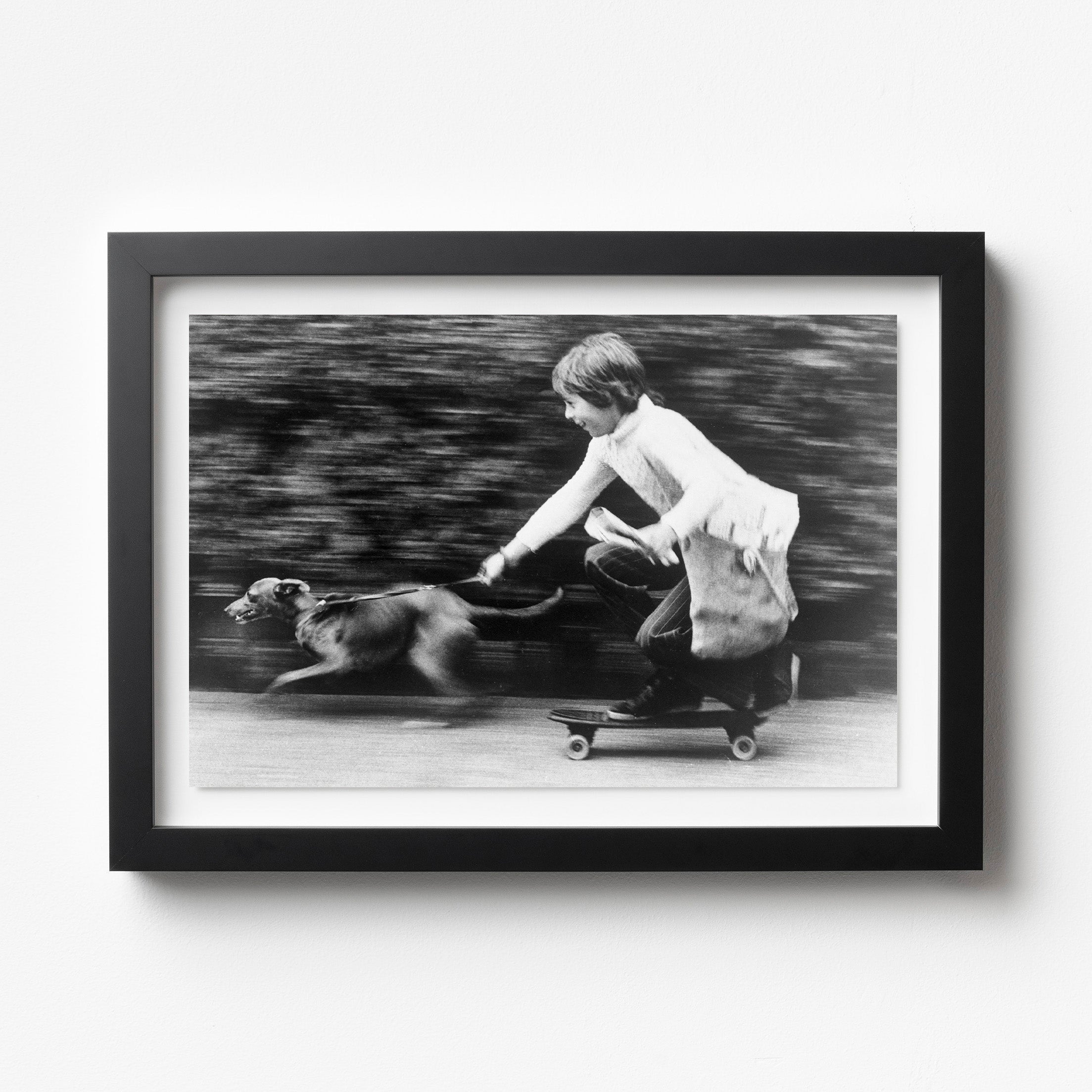 The Paperboy – Fine Art Americana Photography Print, California. Dale Marsh uses his skateboard and his whippet, Penny, to deliver the daily news. This 1965 photograph captures a moment of pure, youthful ingenuity, highlighting the rhythmic balance between the early clay-wheeled board and the elegant stride of his canine companion. It stands as a definitive portrayal of neighborhood camaraderie, freezing the sun-drenched and unhurried energy of a vintage California morning. The nostalgic monochrome tones and dynamic composition bring a sense of movement and whimsical charm to any interior. A sophisticated choice for creative studios or modern living rooms, this print offers a timeless tribute to the enduring and playful icons of American street culture.