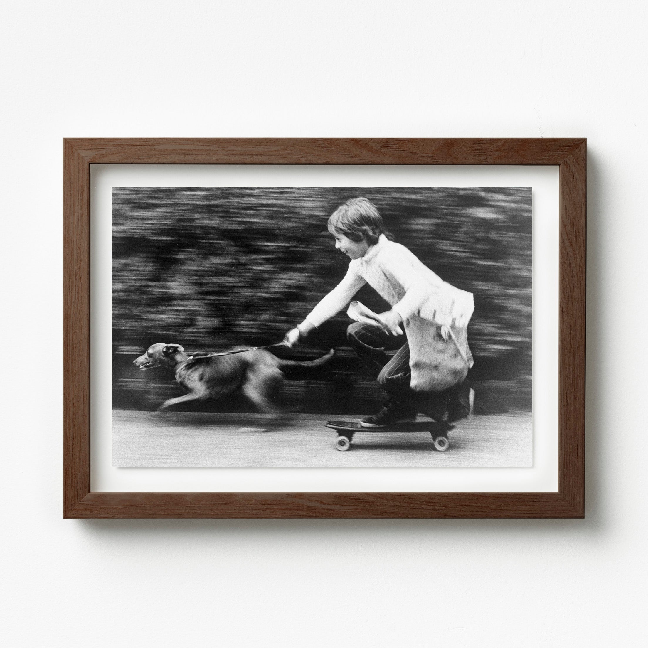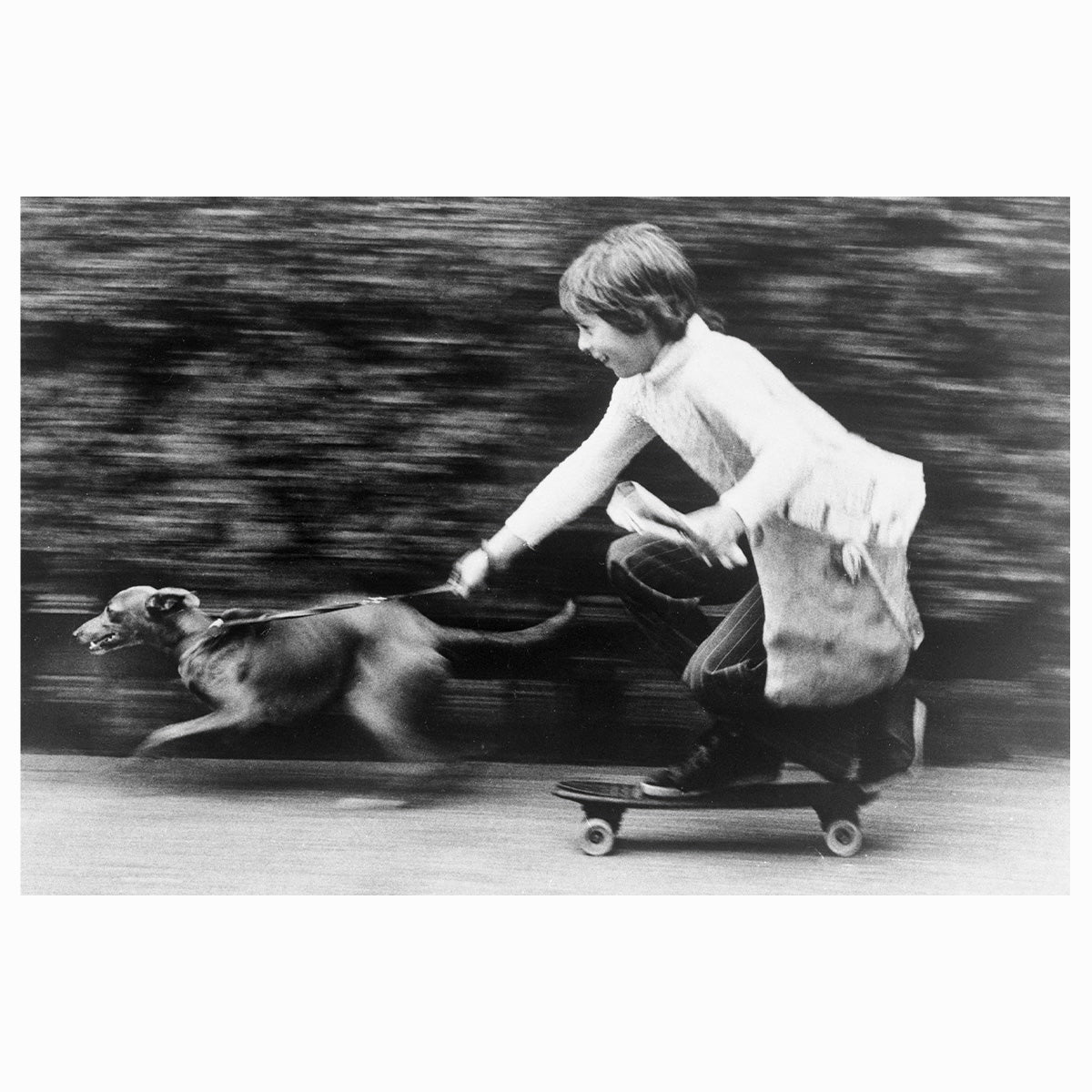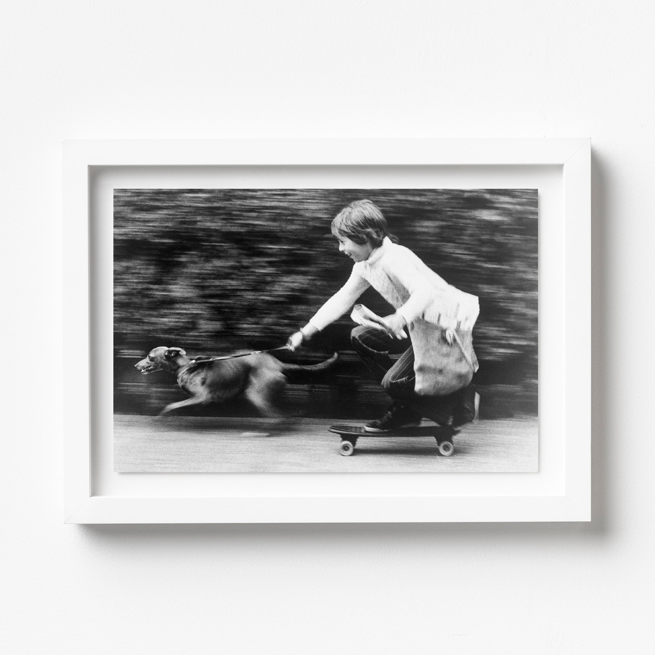 This 1965 archival photograph captures a young Dale Marsh navigating a suburban sidewalk on his skateboard, accompanied by his whippet, Penny. Utilizing the early "sidewalk surfing" trend as a practical tool for his paper route, the image documents a charming intersection of mid-century Americana and the evolving youth culture of the sixties. It remains a rare and endearing record of suburban life, preserving the resourceful and adventurous spirit that defined the first generation of American skateboarders.