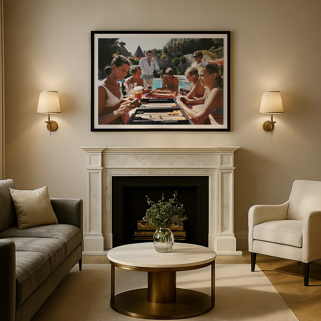 Backgammon Players – Archival Photography Print, Spain 1970. A group of people playing backgammon by a swimming pool at Marbella Beach Club, Spain, September 1970. Captured by Slim Aarons, this relaxed poolside scene embodies the elegance and ease of 1970s leisure. The warm sunlight, stylish swimwear, and casual camaraderie evoke a timeless sense of summer sophistication — a glimpse into the world of effortless glamour Aarons so masterfully documented. This vibrant photograph complements spaces meant for gathering and relaxation, such as living rooms or lounges, adding a refined yet inviting touch to any interior.