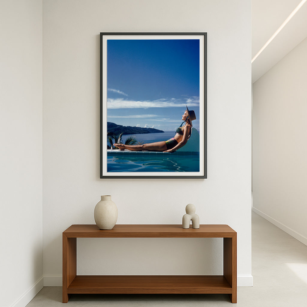 Between Sea And Sky – Archival Photography Print, Acapulco 1961. Ingrid Morath sunbathes by a swimming pool next to the sea in Acapulco, 1961. Ingrid was born in Rio de Janeiro and lives in Mexico City. Photographed by Slim Aarons, this serene image captures the harmony of leisure and landscape that defined mid-century glamour. The crisp geometry of the pool against the vast horizon blurs the boundary between sea and sky, evoking a sense of calm, elegance, and freedom. A statement piece for minimalist and modern interiors alike, this photograph brings a sense of balance and sophistication — a timeless ode to sunlit luxury and the art of living beautifully.