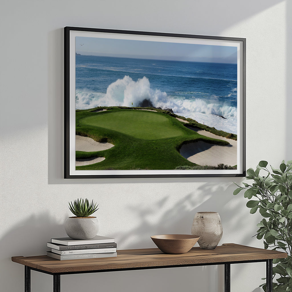 Pebble Beach – Famous Golf Photography Print, Northern California. General view of the seventh hole before the final round of the AT&T Pebble Beach National Pro-Am at Pebble Beach Golf Links on February 14, 2010 in Pebble Beach, California. Captured by Stuart Franklin, this elevated perspective showcases the harmony between course design and coastal terrain. The emerald green fairways contrast beautifully with the Pacific horizon, creating a timeless image of balance and precision. Ideal for golf enthusiasts, collectors, or interiors that value natural elegance and sporting heritage. This photograph enhances living rooms, studies, or recreational spaces with its calm energy and classic charm.
