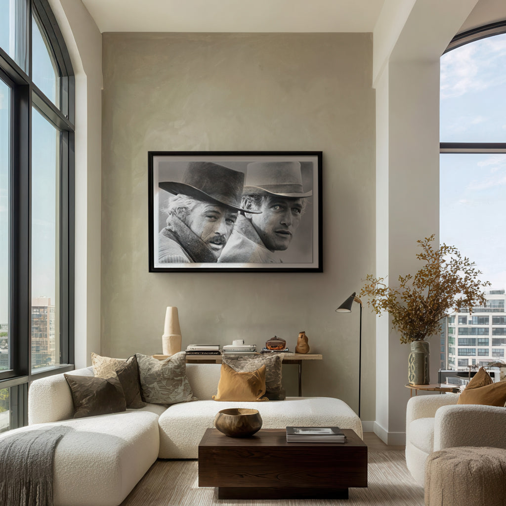 Butch Cassidy and the Sundance Kid – Classic Film Photography Print, 1969. This archival photograph features Robert Redford (left) as the Sundance Kid and Paul Newman as Butch Cassidy in a scene from the 1969 Western masterpiece Butch Cassidy and the Sundance Kid. Captured in timeless black and white, the image highlights the film’s iconic partnership and rugged Western aesthetic. A perfect piece for collectors of classic cinema, Hollywood history, or vintage portraiture — this photograph embodies the charisma, friendship, and cinematic style of late-1960s American filmmaking.
