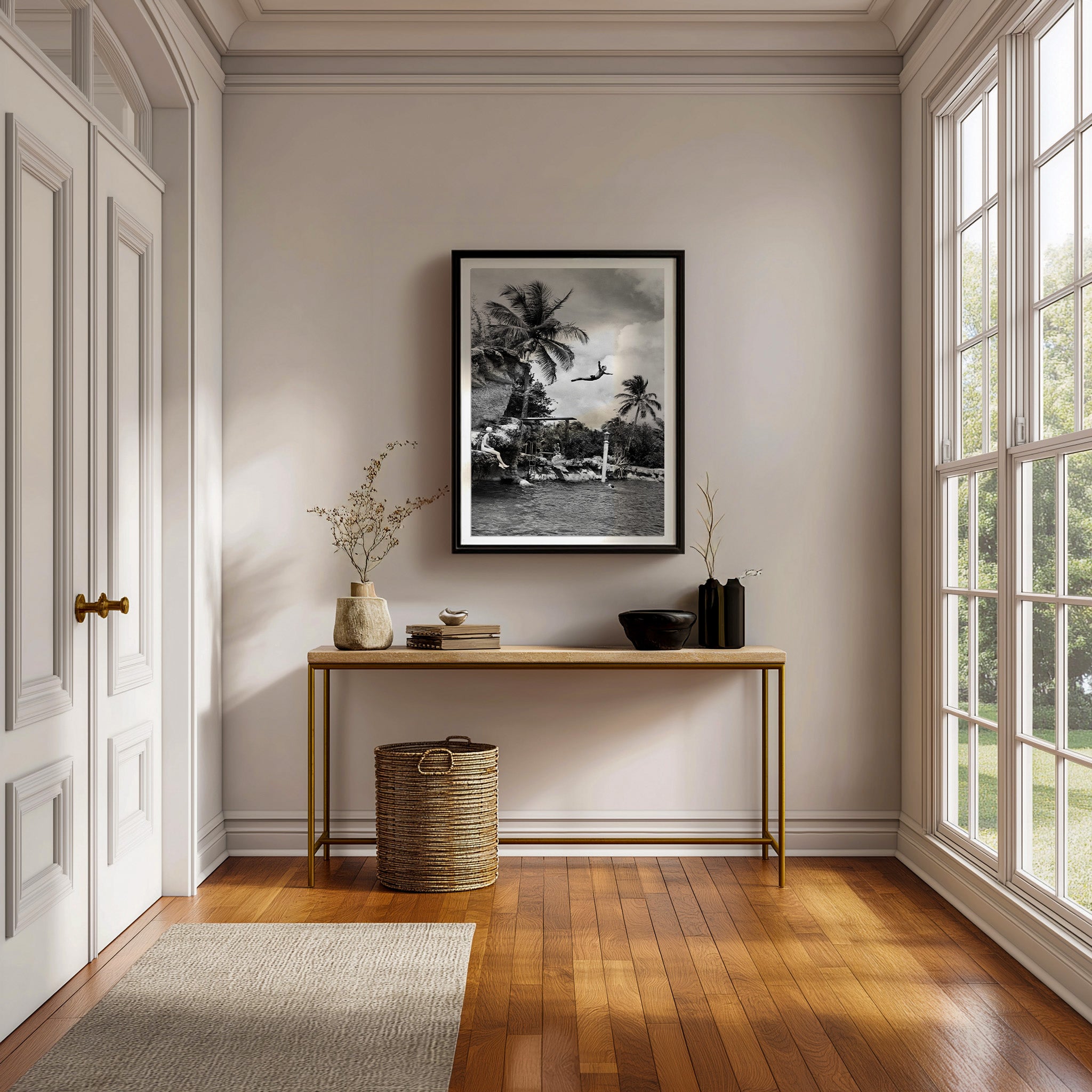Swan Dive – Vintage Photography Print, 1940. This classic mid-century photograph depicts a man executing a graceful swan dive from a rocky ledge into a serene pool below. Taken circa 1940, the image showcases the timeless beauty of human movement against a lush tropical backdrop, framed by palm trees and open sky. The contrast of light and shadow, paired with its playful sense of leisure, makes this archival print a stunning addition to any collection. Ideal for lovers of vintage photography and moments of sunlit escape.