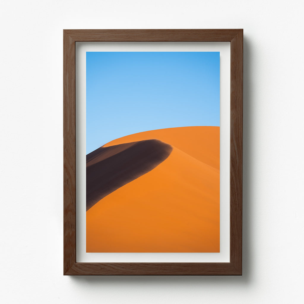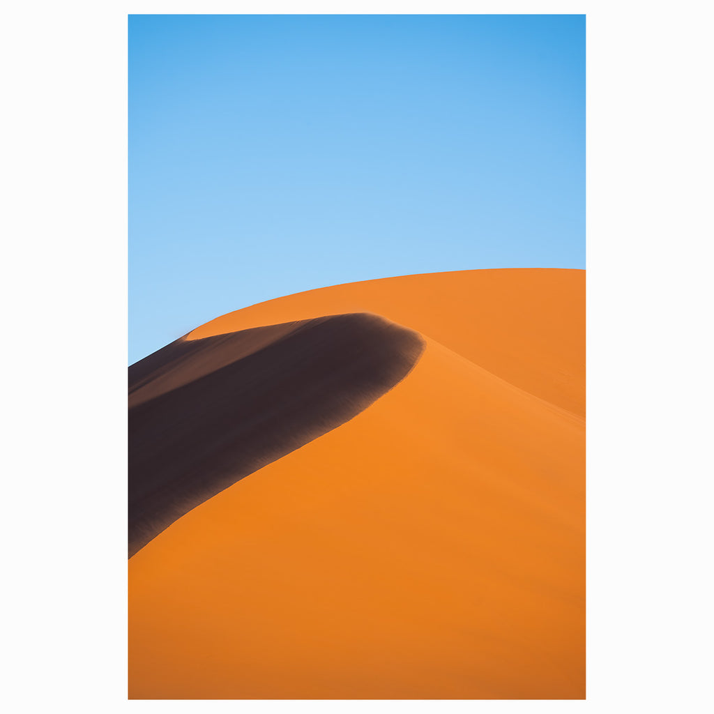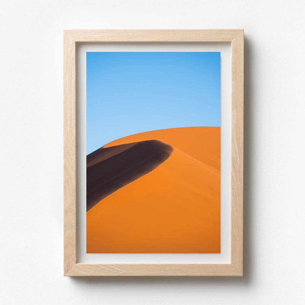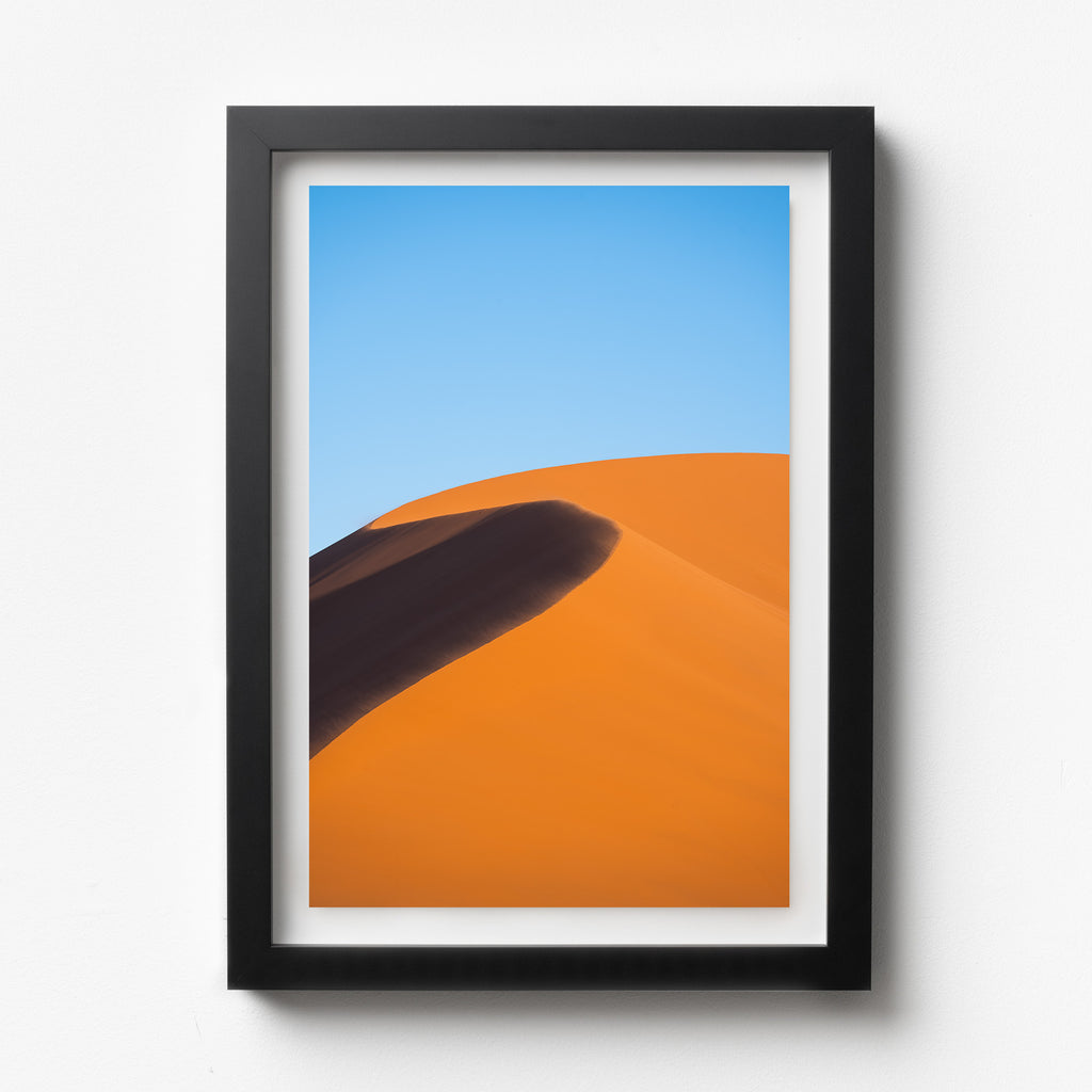 Dune – Fine Art Desert Photography Print. Photographed in Namibia’s iconic Dune 2, just outside Deadvlei, this image captures the sculptural grace of the desert at sunrise. The curve of sand and the sharp play of light and shadow evoke the balance between strength and fragility that defines these vast landscapes. Here, the desert becomes minimal and architectural. Dawn light softens the sand into warm gradients, while the shadowed ridge adds bold, natural contrast — quiet, expansive, and timeless. It brings a sense of space and breath into the room, making it a striking addition to modern interiors, gallery walls, and environments seeking calm, openness, and natural elegance.