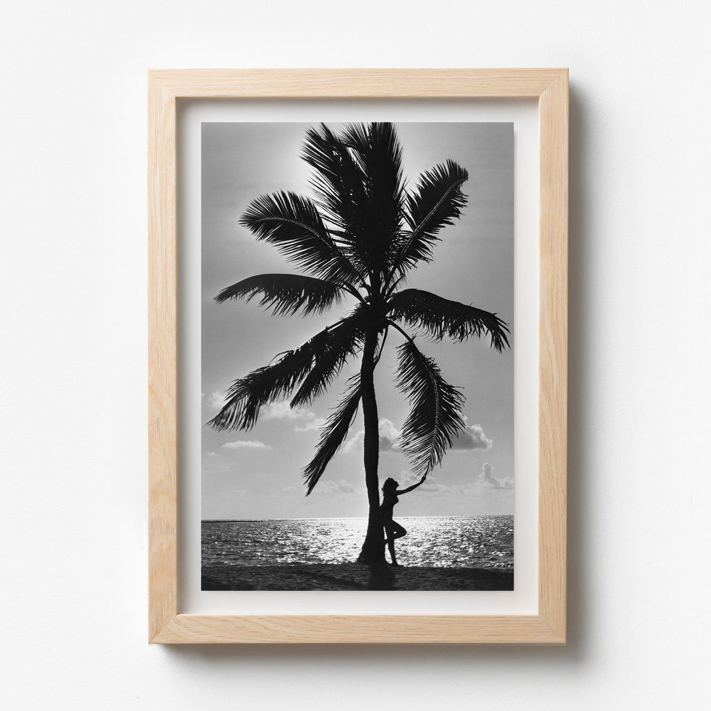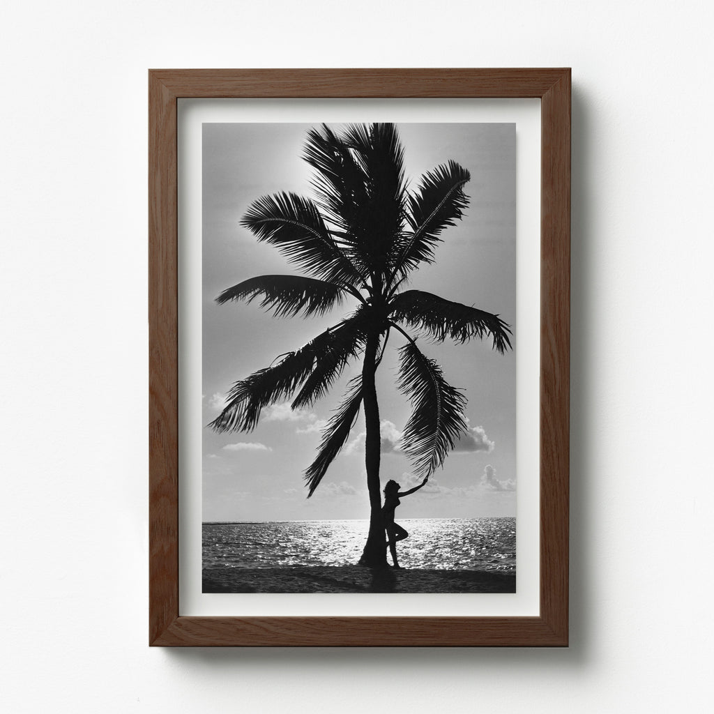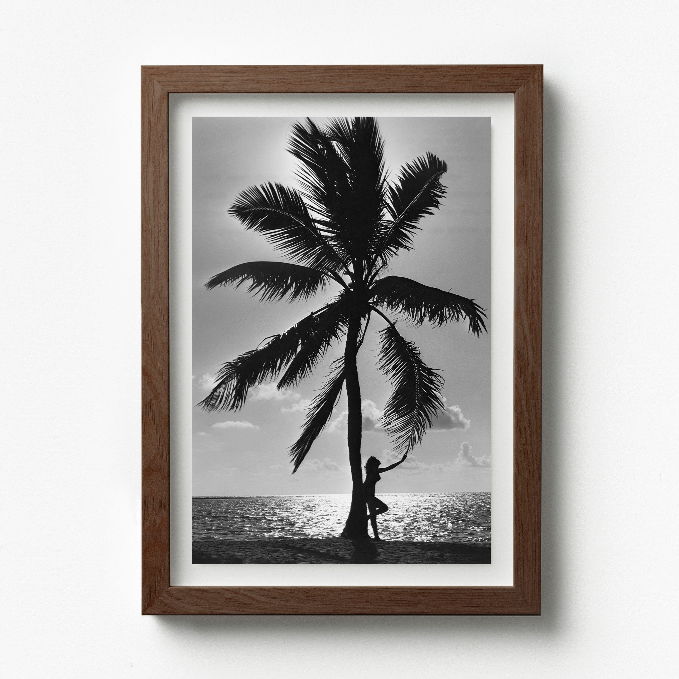 Sunset Silhouette – Fine Art Coastal Photography Print, 1970. A striking vintage image featuring a palm tree standing tall by the ocean at sunset, Florida, circa 1970. The soft contrast of light and shadow creates a peaceful tropical silhouette that embodies tranquility and timeless beauty. This elegant coastal composition brings a sense of serenity and balance, making it perfect for beach homes, minimalist interiors, or spaces that celebrate natural light and open horizons. A piece that evokes both calm and wanderlust.