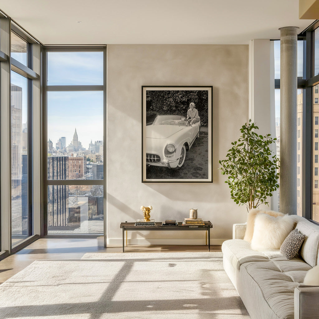 Sophia Loren with her 1954 Corvette – Archival Photography Print, Los Angeles 1958. This elegant portrait captures Sophia Loren at her most radiant — a cinematic fusion of Italian glamour and American style. The gleaming Corvette reflects a moment when Hollywood sophistication met automotive artistry. An exquisite addition to refined interiors, this print enhances bedrooms, dressing areas, or modern living spaces where timeless beauty and classic elegance shine.