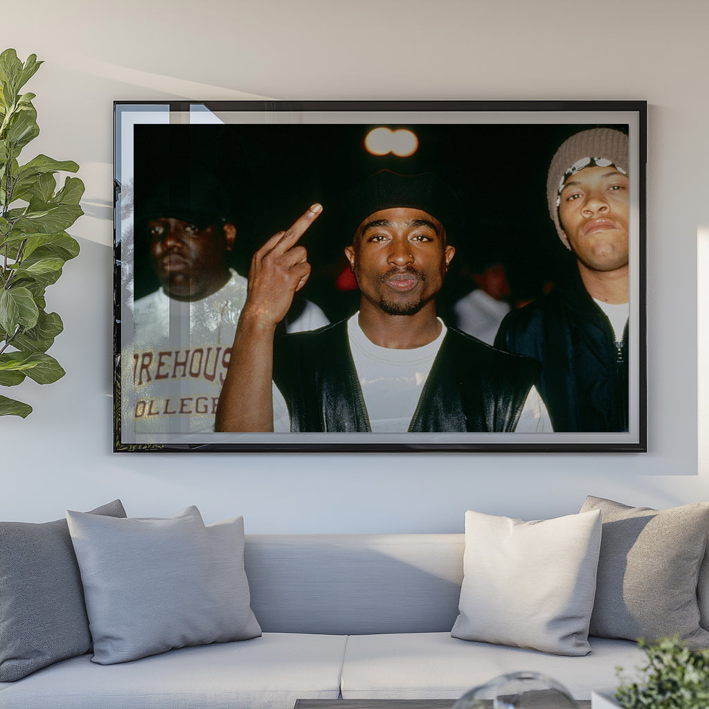 Tupac and Biggie – Archival Hip-Hop Photography Print, New York, 1993. Rappers The Notorious B.I.G., Tupac Shakur, and Redman backstage at a Tupac Shakur performance at Club Amazon on July 23, 1993, in New York City. This historic black-and-white photograph freezes a powerful moment in hip-hop history, bringing together three legendary artists in one frame. With the raw charisma of Tupac at its center, the image embodies the cultural pulse and authenticity of the early 1990s rap scene. Perfect for music enthusiasts, collectors, or admirers of street culture, this piece channels the energy and influence of a defining generation in American music.