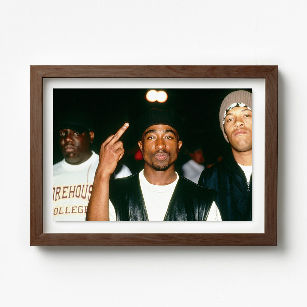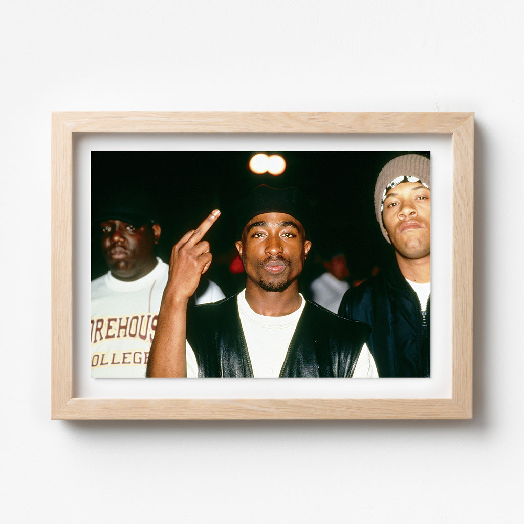 Tupac and Biggie – Archival Hip-Hop Photography Print, New York, 1993. Rappers The Notorious B.I.G., Tupac Shakur, and Redman backstage at a Tupac Shakur performance at Club Amazon on July 23, 1993, in New York City. This historic black-and-white photograph freezes a powerful moment in hip-hop history, bringing together three legendary artists in one frame. With the raw charisma of Tupac at its center, the image embodies the cultural pulse and authenticity of the early 1990s rap scene. Perfect for music enthusiasts, collectors, or admirers of street culture, this piece channels the energy and influence of a defining generation in American music.
