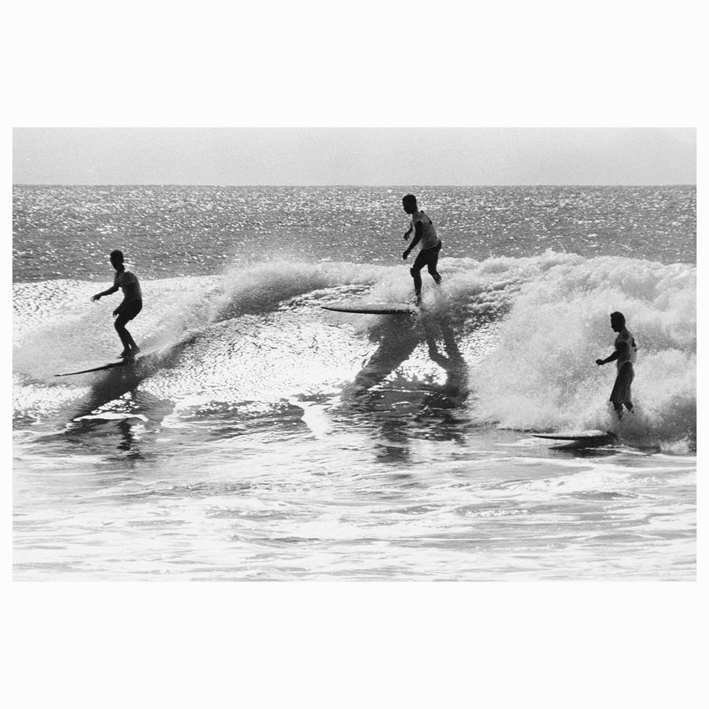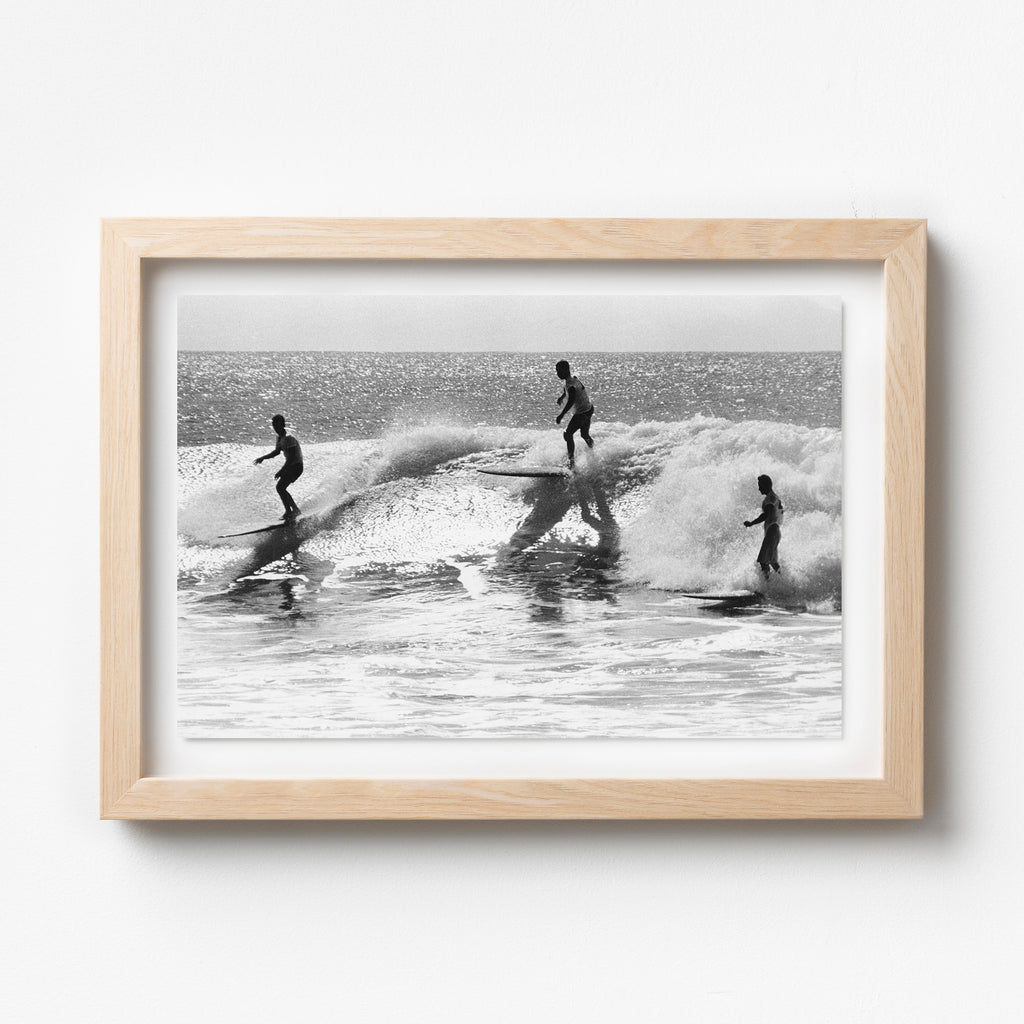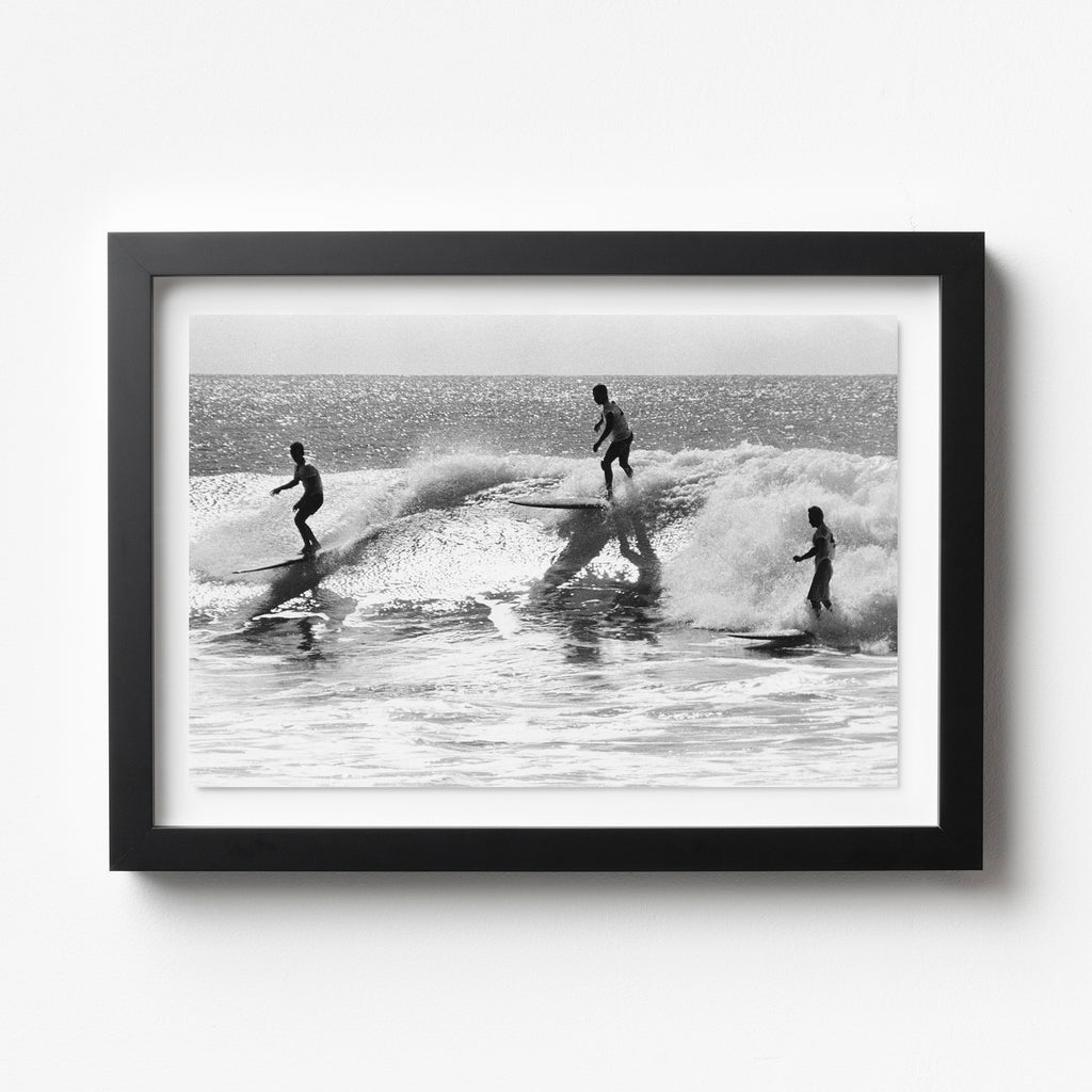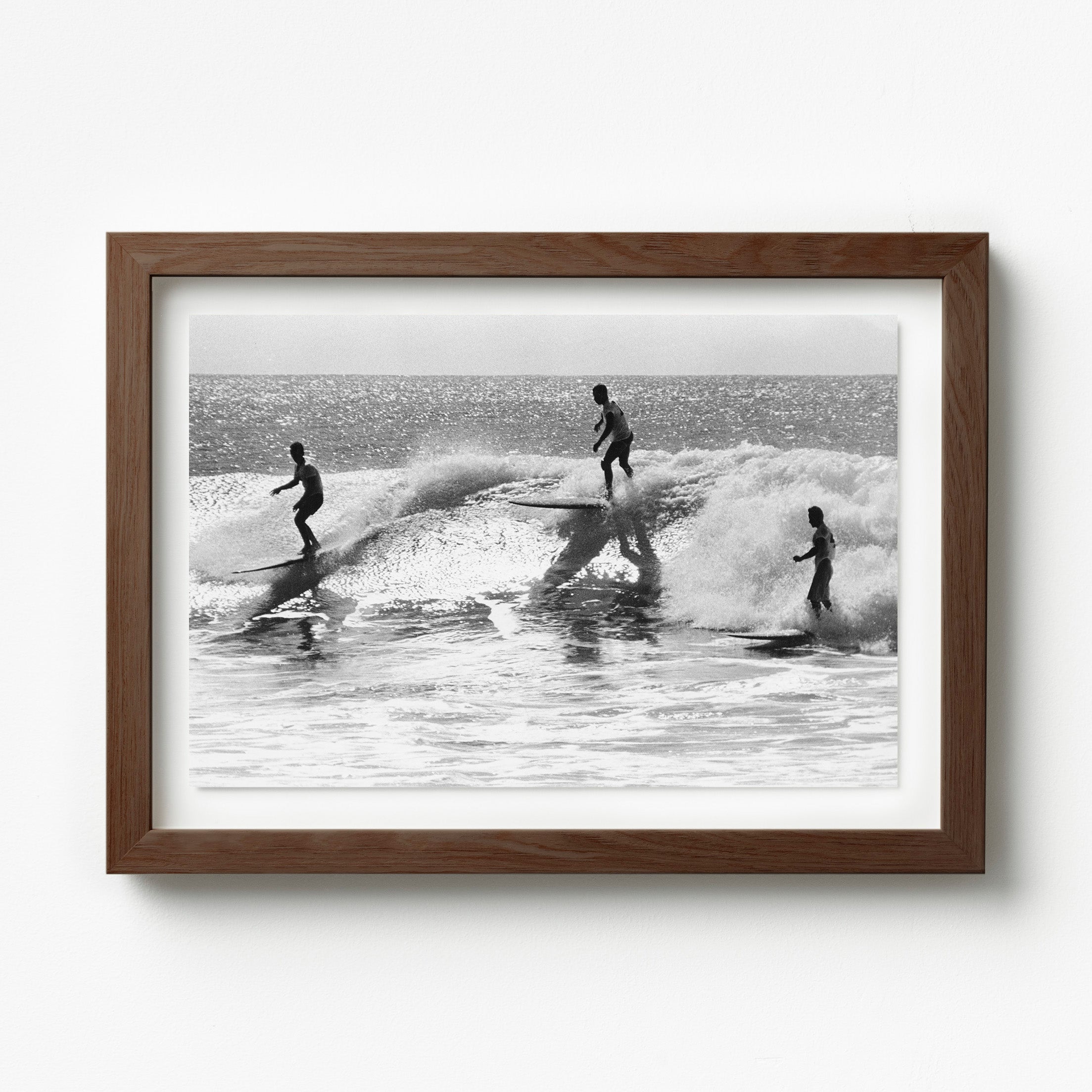 Surfing In Hawaii – Archival Photography Print, circa 1970 Surfers riding a wave, Hawaii, circa 1970. This striking black-and-white photograph captures the essence of Hawaii’s surfing culture in its purest form. Three surfers ride side by side, perfectly balanced against the shimmering ocean backdrop. The image reflects the camaraderie, skill, and timeless beauty that define surfing as both sport and lifestyle. Ideal for beach houses, contemporary interiors, or collectors of vintage surf photography. It brings a sense of energy, sunlight, and nostalgic coastal charm to any modern space.