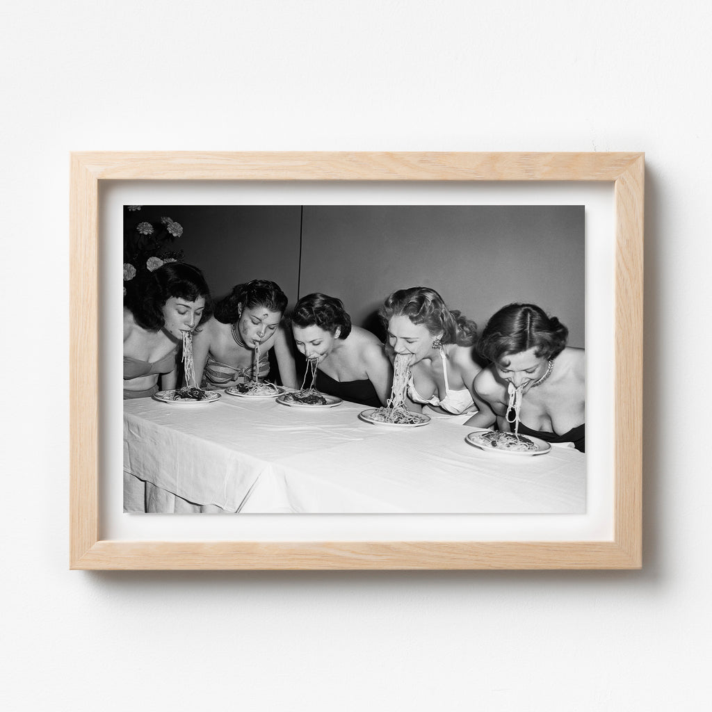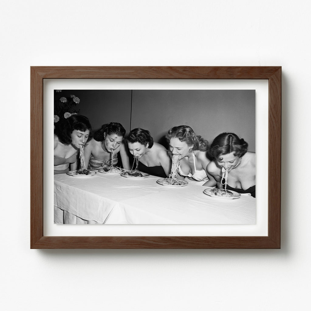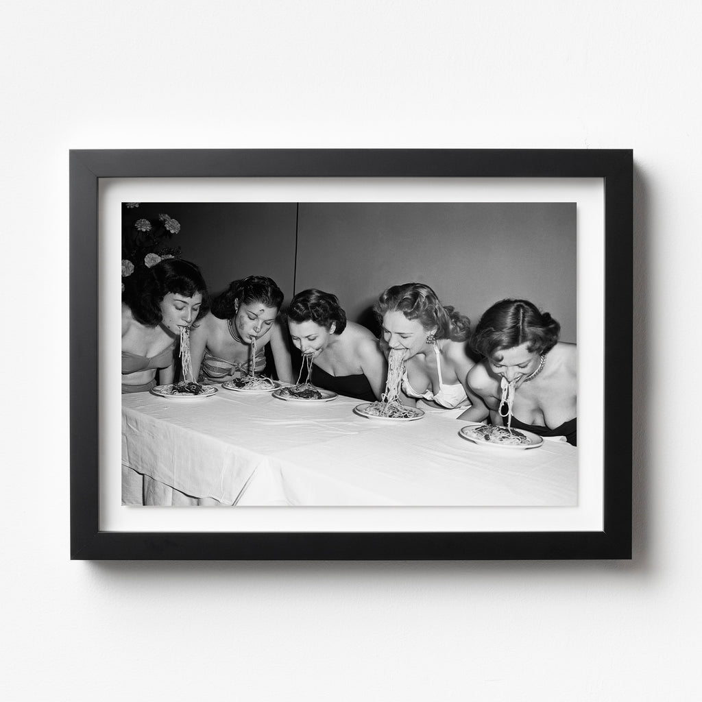 Girls Night Out – Vintage Black and White Photography Print. Five Broadway show girls participated in a "Spaghetti Swooshing" contest. They had to eat a plate of spaghetti and sauce without using their hands. This photograph embodies postwar optimism and lighthearted entertainment culture, where laughter and leisure defined the era. The candid energy and playful composition make it both nostalgic and irresistibly eye-catching. Perfect for kitchens, dining spaces, or gallery walls looking for a dash of humor and vintage flair. A timeless reminder of joy, spontaneity, and shared fun