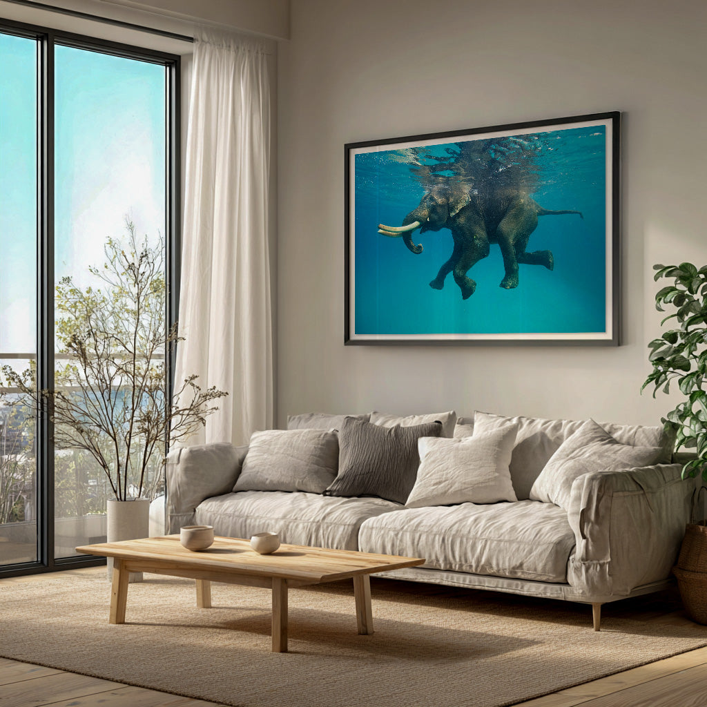 Water Weight – Fine Art Wildlife Photography Print, Andaman Islands, India. Swimming elephant, Andaman Sea, India. This striking photograph presents a rare moment of calm and wonder as an elephant swims through tropical waters, its form reflected in the blue depths. The juxtaposition of strength and stillness in this scene speaks to a unique connection with nature. Whether displayed in a living room, study, or gallery wall, this print brings a peaceful yet powerful presence to any space.