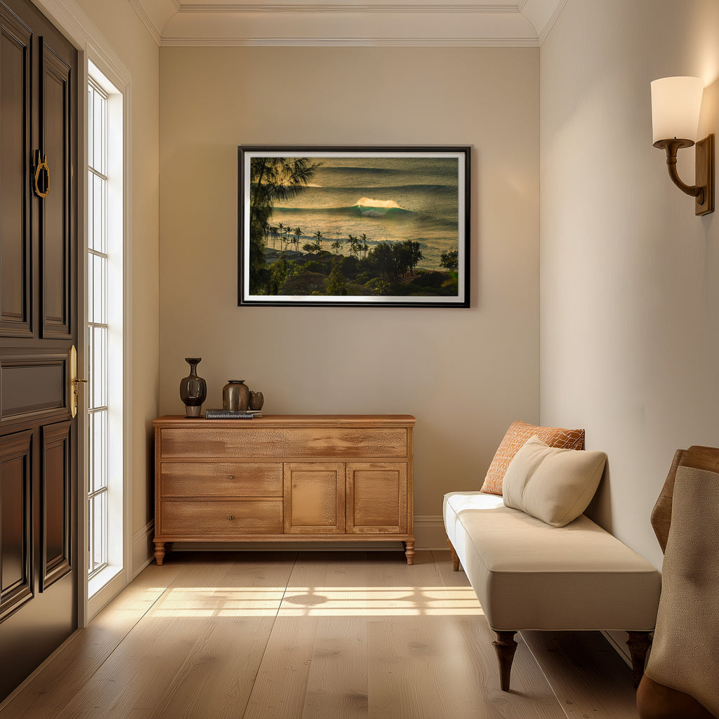 North Swell – Hawaiian Surf Photography Print, Oahu, Hawaii. Anyone who’s been to Pipeline knows that feeling, walking up the sand for the first time, hearing the roar, seeing the size, the energy, the magic of it all. I took a gamble shooting from the cliffs that evening, but as the light faded and the sets rolled through, it felt like I was seeing the North Shore breathe from above. Framed by tropical palms and the quiet charm of island living, North Swell is a tribute to Hawaii’s enduring surf culture and the harmony between ocean and light. Ideal for collectors of fine art photography, coastal interiors, and lovers of the sea.