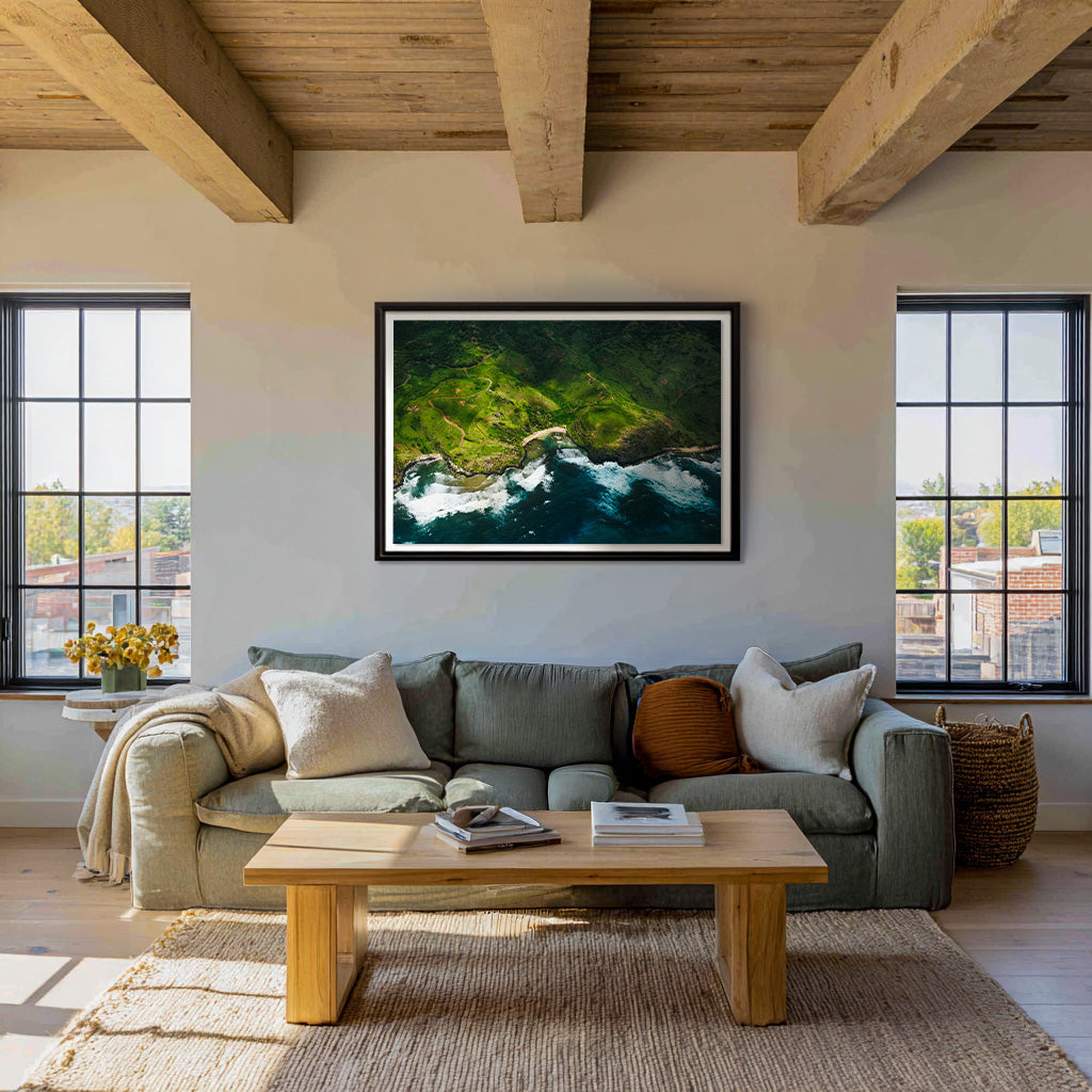 The Cove – Fine Art Photography Print, Hawaii. Moloka’i, Hawaii. This is what I assume to be someone’s slice of heaven, a large property with a private beach on the coast, no one around. I had just finished shooting a job with a friend on Oahu and our buddy who was still accumulating hours on his pilot’s license took us up for a flight over to Moloka’i. I always find it fascinating to fly over pieces of land and see all the different types of properties, it’s my definition of window shopping. This photograph brings a lush sense of escape and tranquility to any interior. Perfect for living rooms or bedrooms where calmness and connection to nature create a grounding atmosphere.