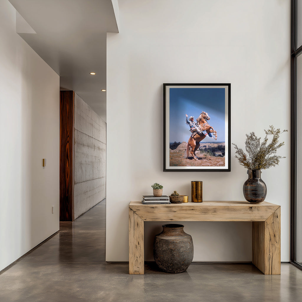 Roy Rogers Riding Horse – Vintage Western Photography Print, 1958. This iconic 1958 photograph showcases Roy Rogers, the “King of the Cowboys,” riding his famous palomino horse, Trigger. The dynamic composition — with Trigger rearing proudly and Rogers waving in his trademark cowboy attire — captures the essence of Hollywood’s golden Western era. Taken on May 12, 1958, this vibrant color image is a timeless tribute to one of America’s most beloved cowboy legends. Perfect for collectors of vintage Western culture, film history, or classic Americana.
