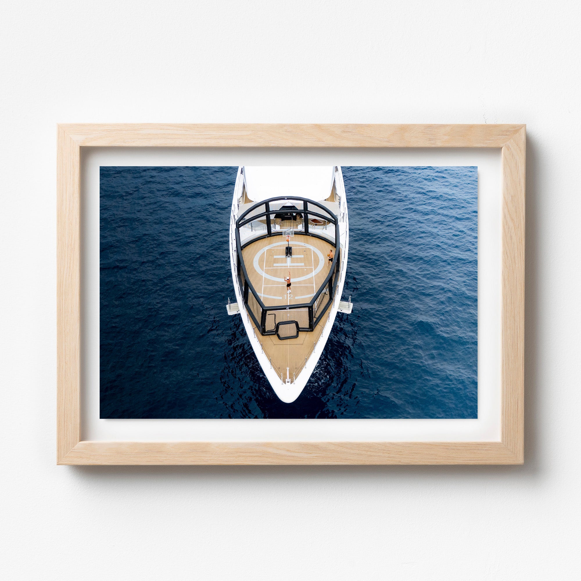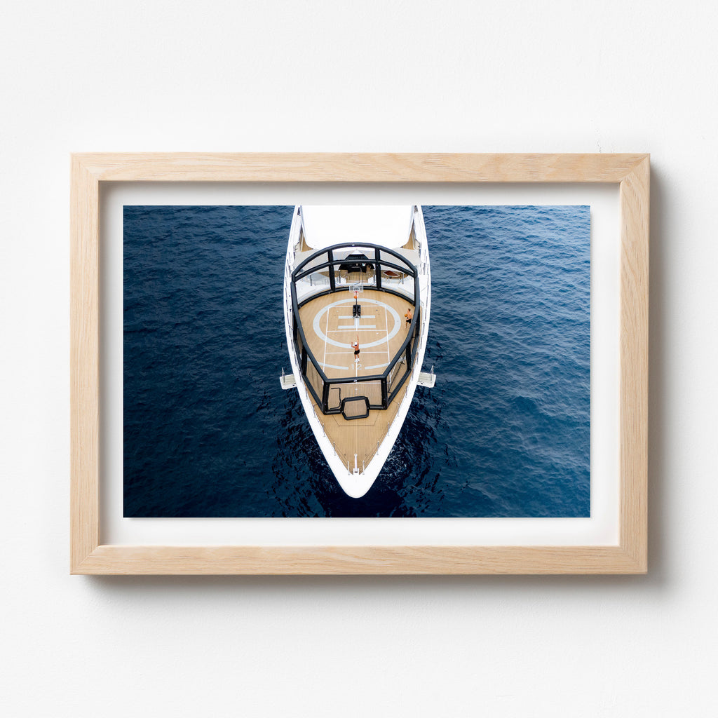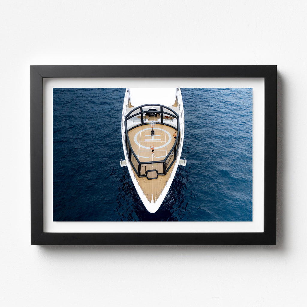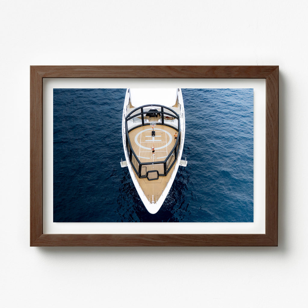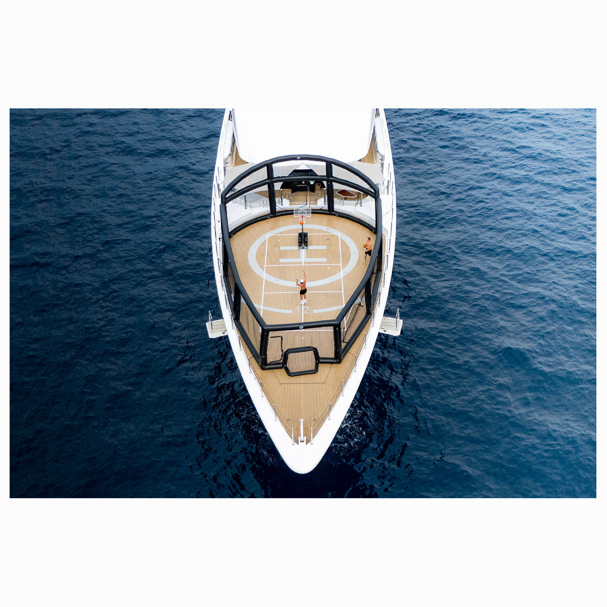 A breathtaking aerial view captures the bow of an opulent luxury yacht gliding across pristine, deep-blue waters. At the forefront, an exclusive basketball court - complete with a sleek black safety enclosure - hosts two players mid-game, blending world-class recreation with maritime elegance. The minimalist symmetry of the yacht, the vastness of the ocean, and the rare indulgence of a sports arena at sea evoke ultimate sophistication and freedom.