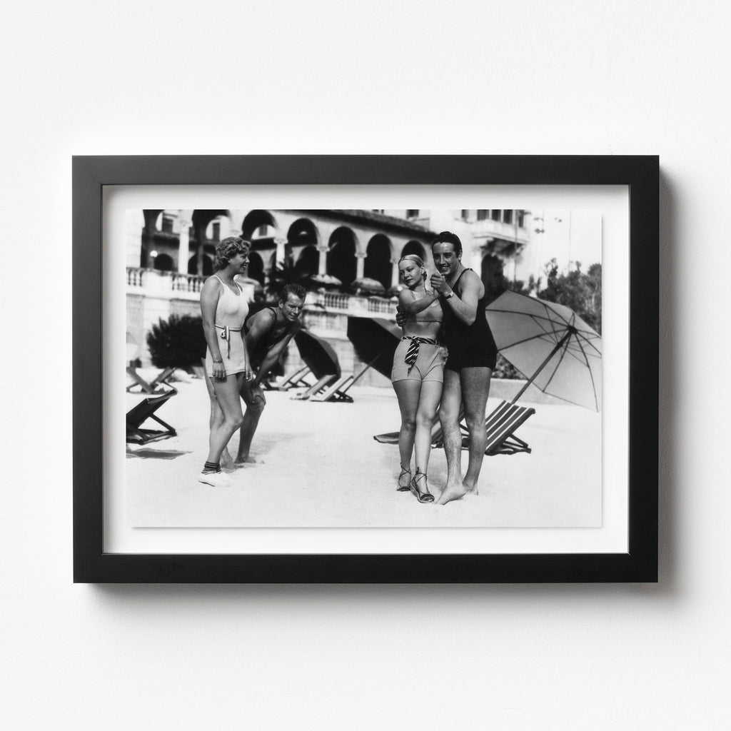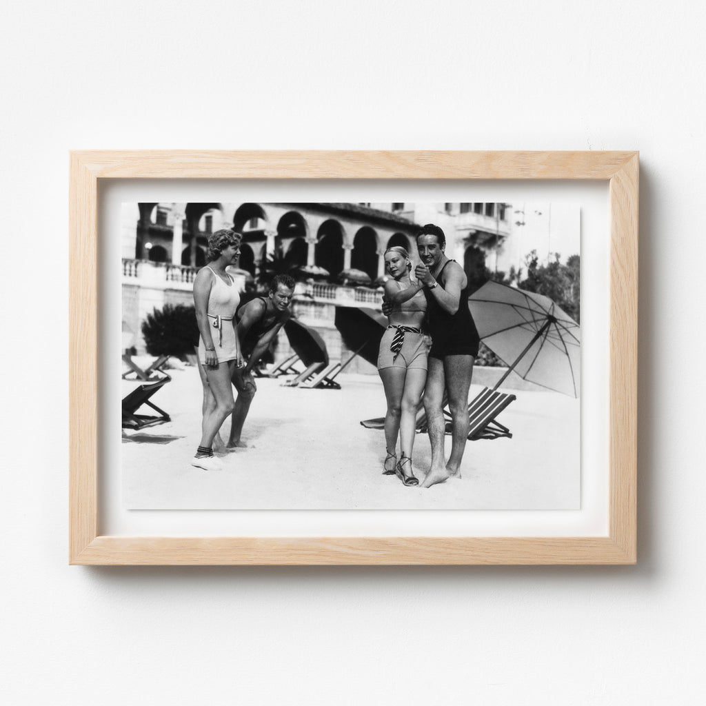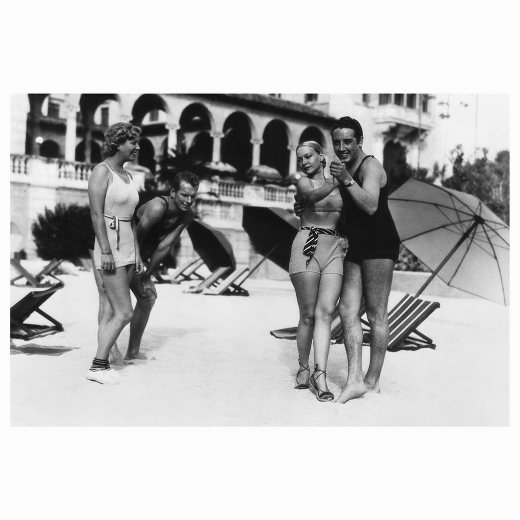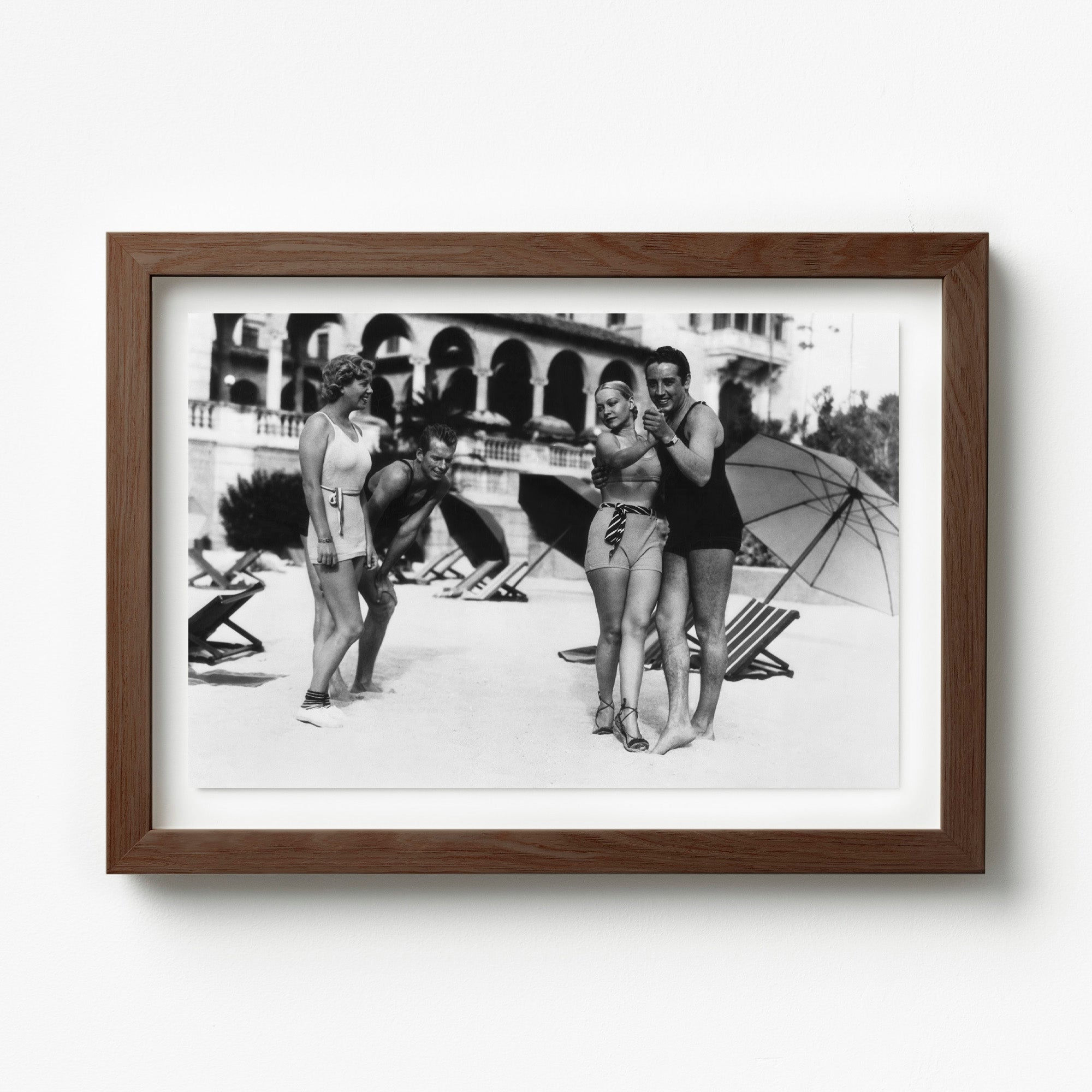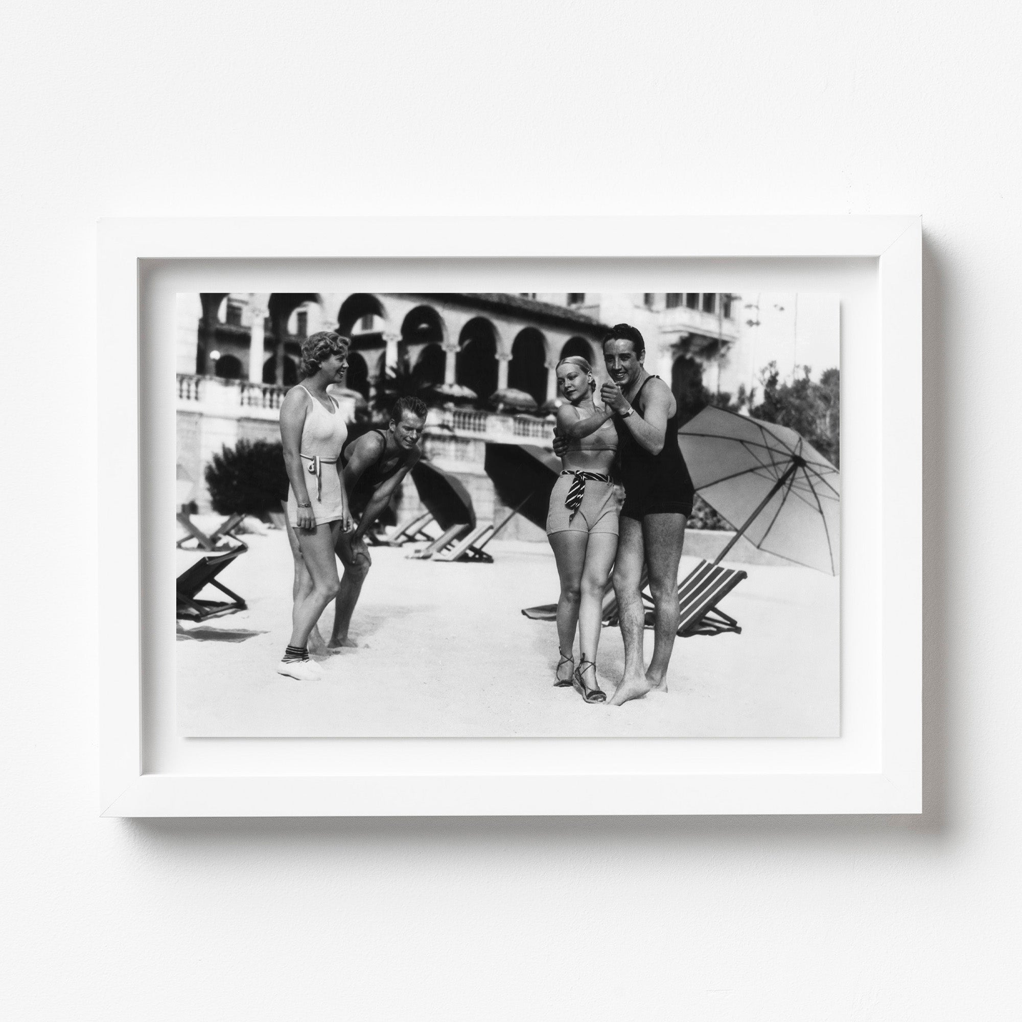 A man and woman in vintage beachwear share a graceful tango lesson on the sand, while two onlookers—Florida State diving champion Marshall Wayne and former women’s Olympic diving champion Georgia Coleman Gilson—watch with interest. In the background, a coastal resort environment evokes early 1930s elegance.