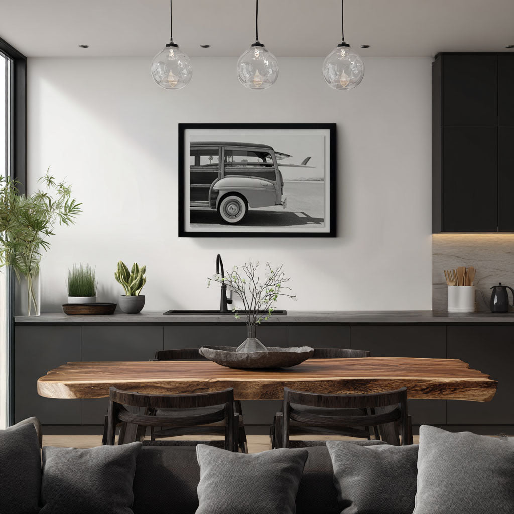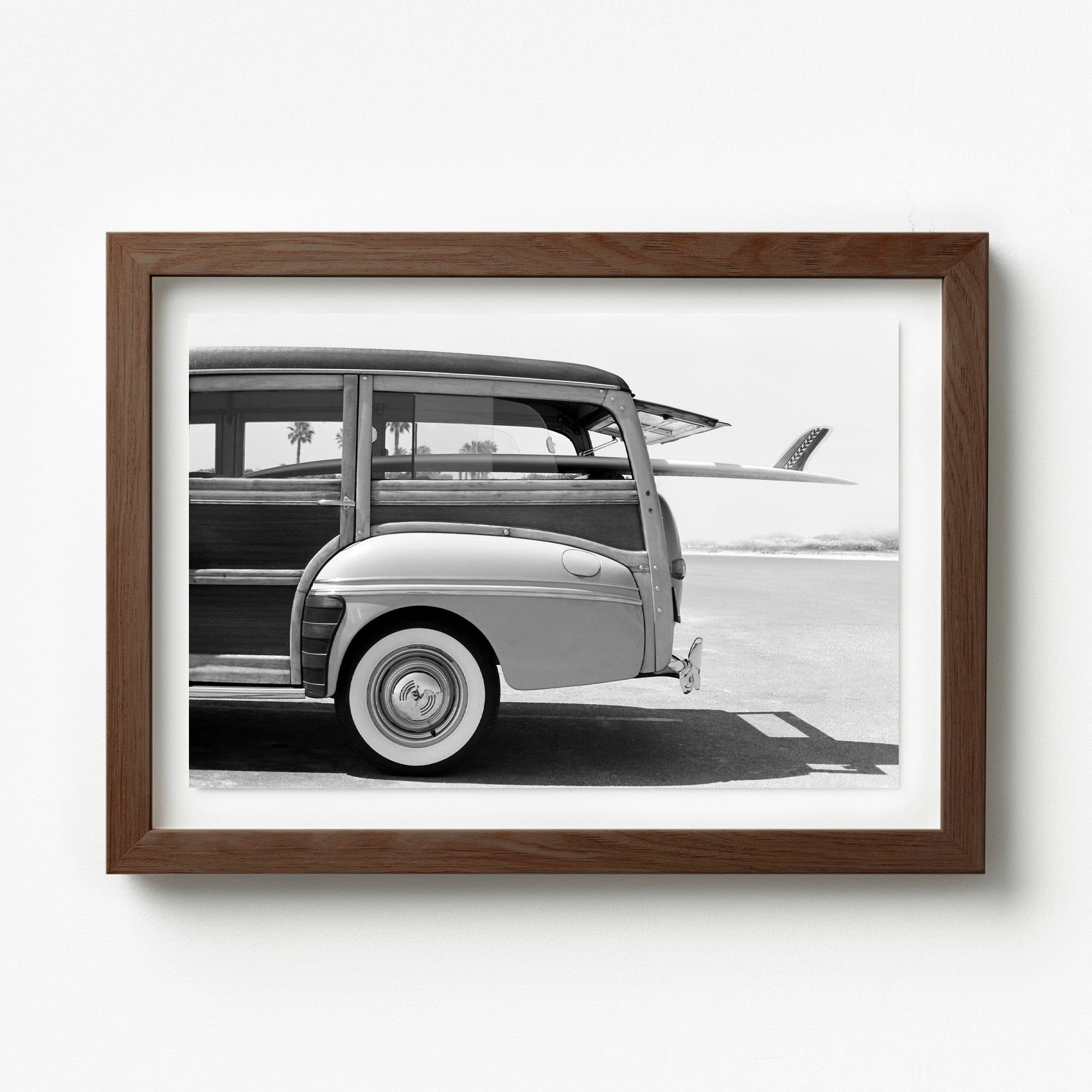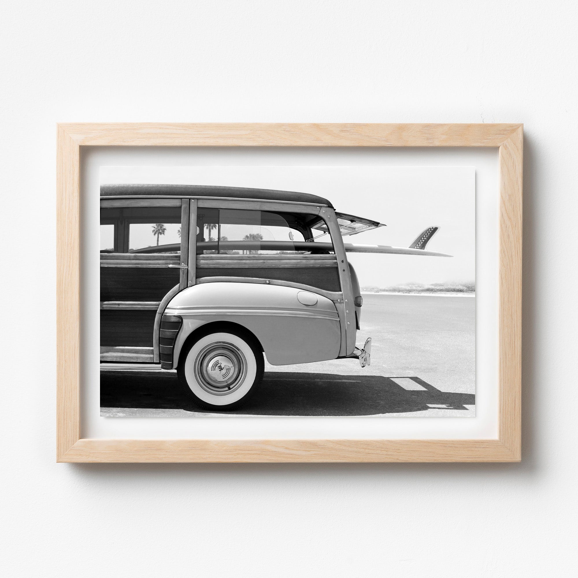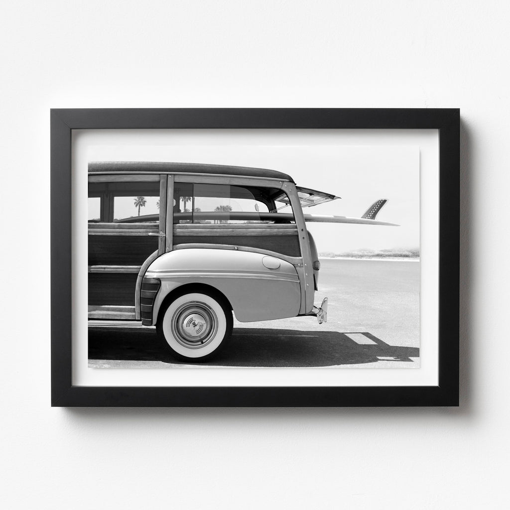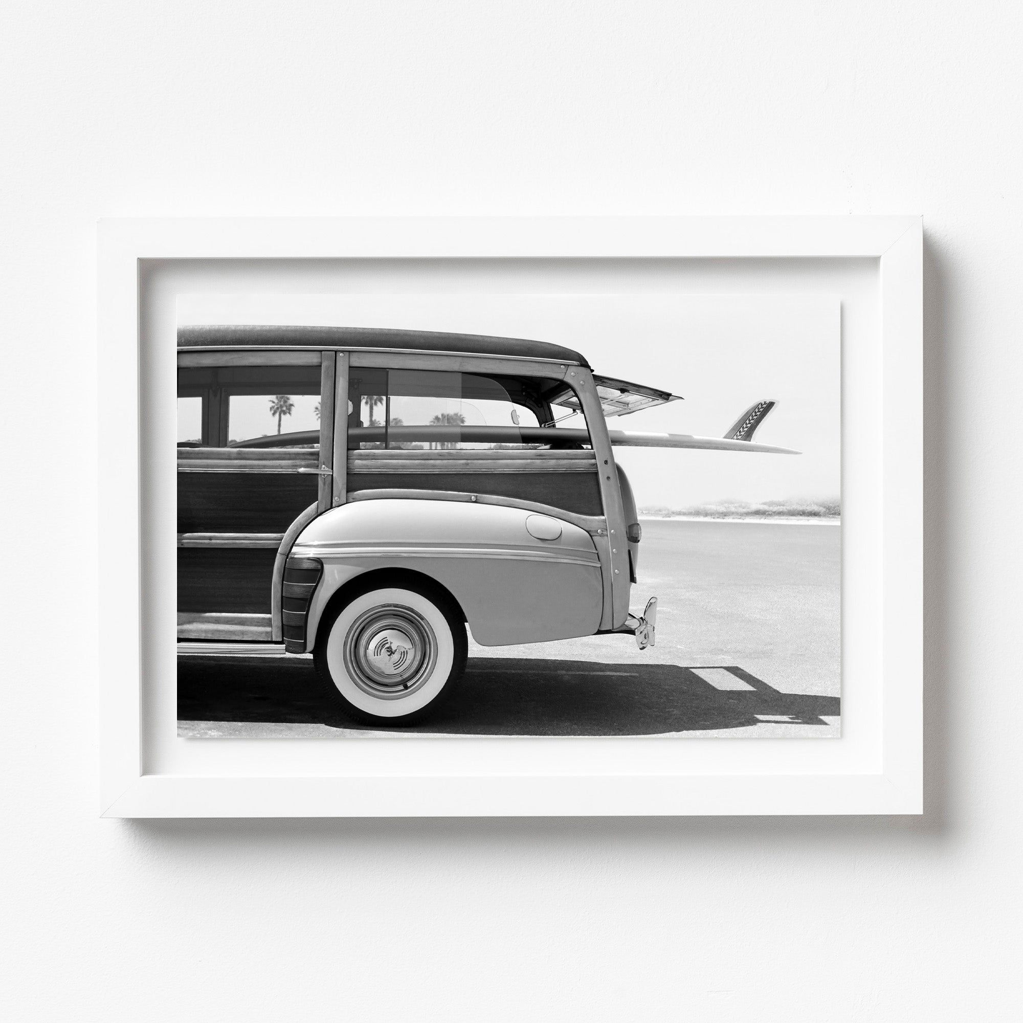 Weekend Woodie – Black & White Surf Photography Print. Old Woodie Station Wagon with Surfboard. Clean side profile highlights wood paneling, a whitewall tire, and a longboard past the tailgate, with distant palms—classic surf culture in crisp black-and-white. This framed vintage coastal automotive scene complements modern, coastal, or mid-century interiors.