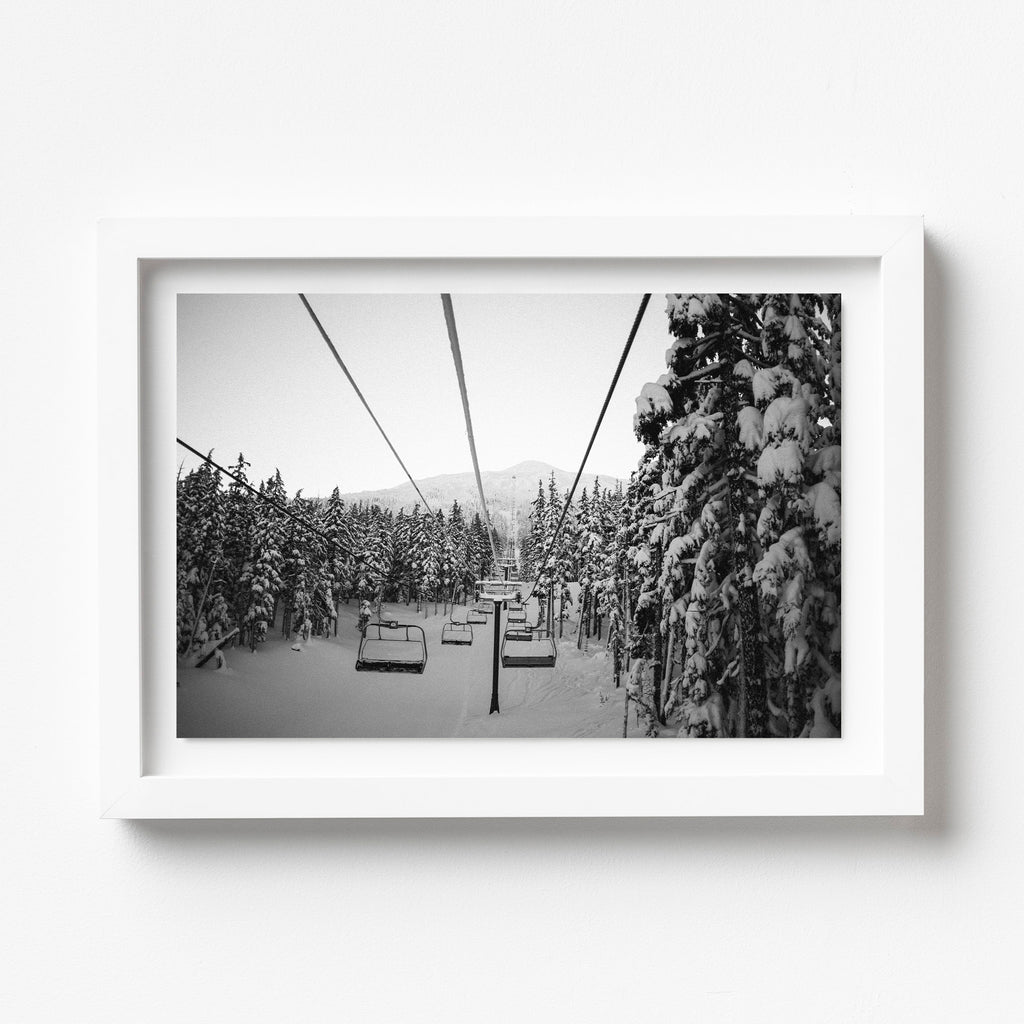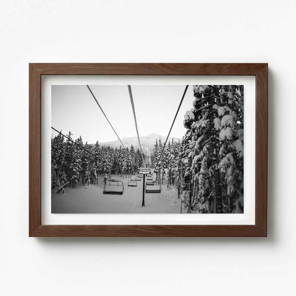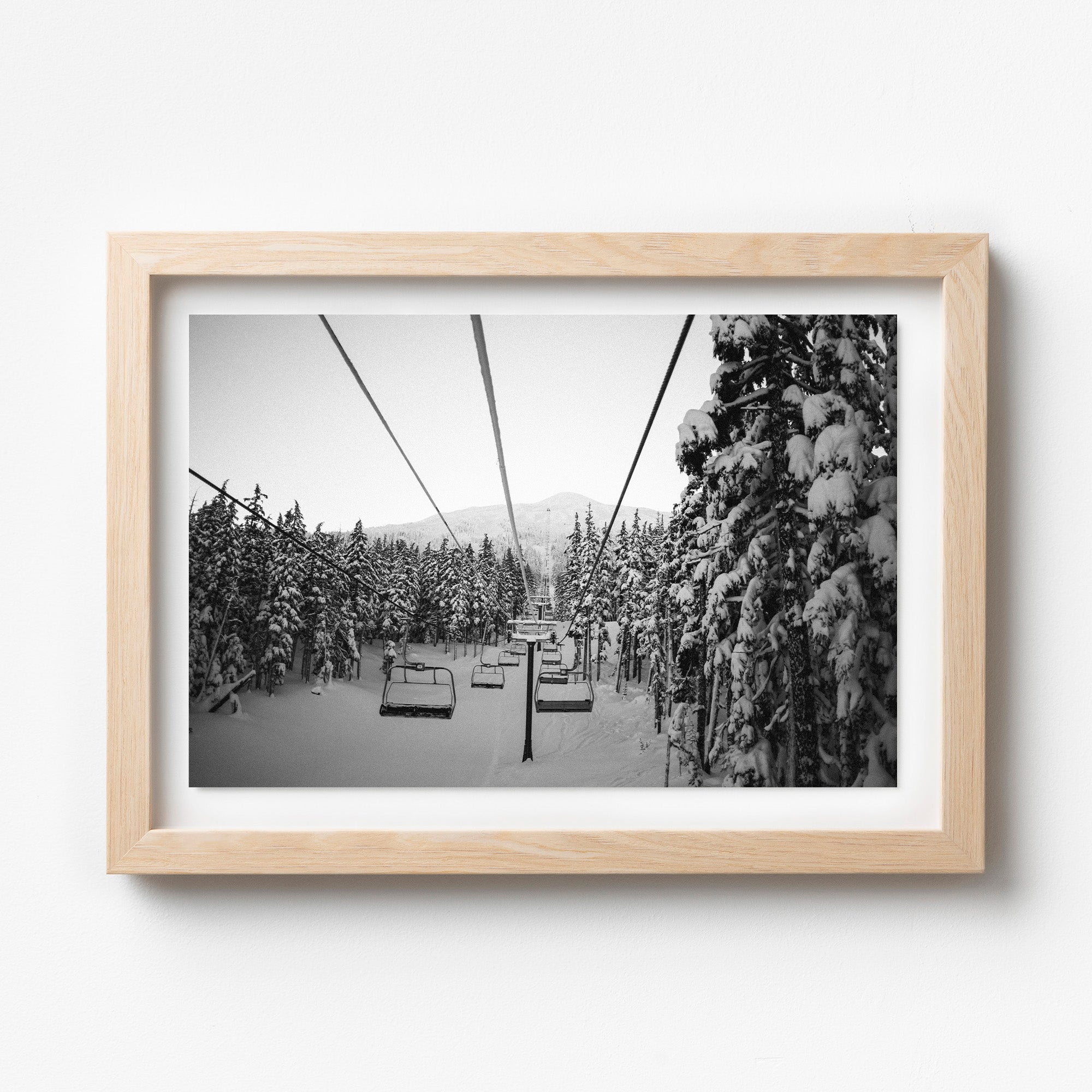 Chairlift – Fine Art Photography Print, Oregon. Mt. Bachelor, Oregon. The absence of color emphasizes the contrasts—the dark steel of the lift against the brightness of snow, the rhythm of lines against the organic forms of nature. It is both a study of geometry and atmosphere, evoking stillness, solitude, and the anticipation of untouched slopes. This photograph complements serene interior spaces, particularly living rooms or mountain lodges, where calm and contemplation meet understated strength.