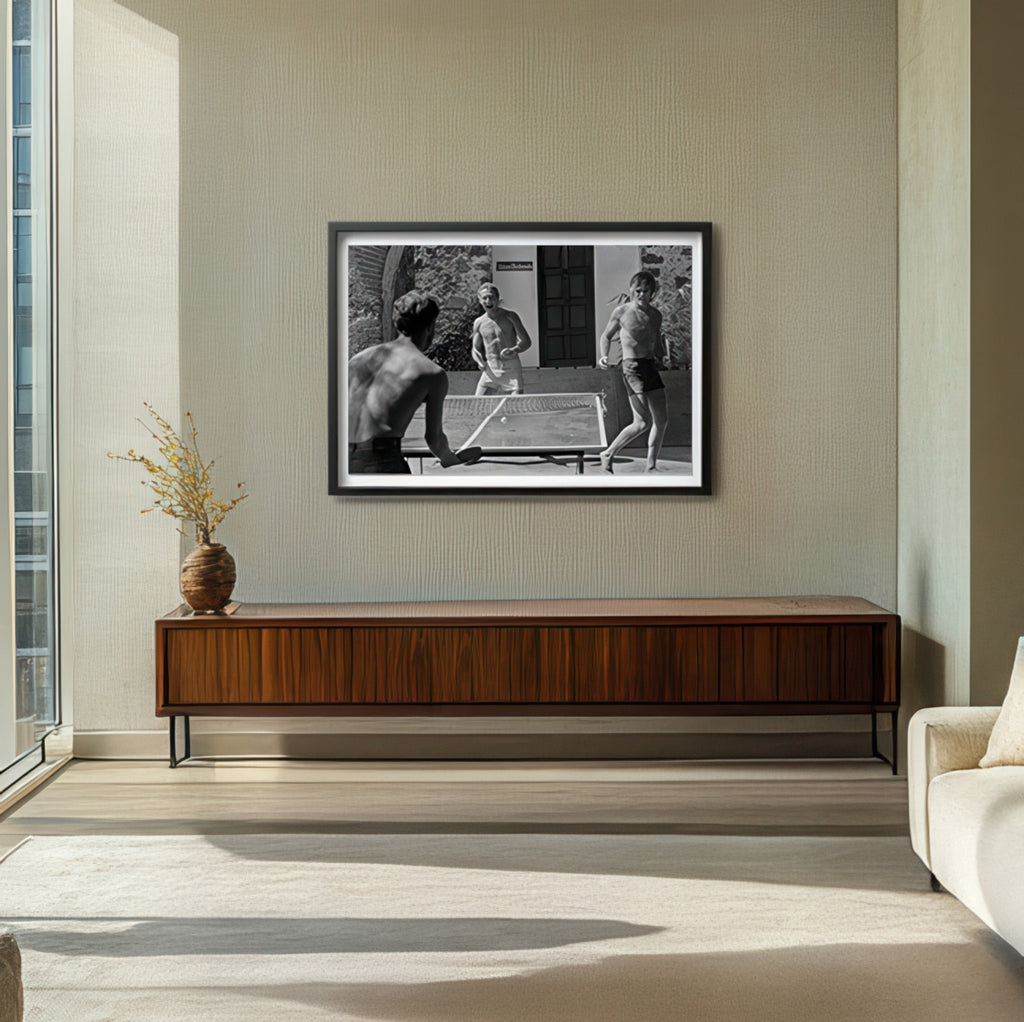 Paul Newman & Robert Redford Play Ping-Pong – Vintage Hollywood Photography Print, 1968. This captivating black-and-white photograph captures actors Paul Newman and Robert Redford enjoying a spirited game of ping-pong during a break from filming Butch Cassidy and the Sundance Kid in 1968. The image reveals a side of classic Hollywood often unseen — moments of friendship, humor, and ease between two of cinema’s most iconic leading men. The rustic Mexican courtyard setting and candid expressions lend the photo warmth and authenticity. Perfect for film enthusiasts or lovers of timeless Hollywood history, this print adds a touch of charm, character, and charisma to any room.